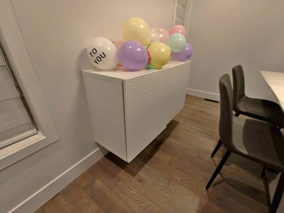Stylish white floating cabinet with textured doors and two compartments inside for storage. Great for entryway, living room, or under a TV. Super clean, looks almost new! You must come and take it off the wall yourself.