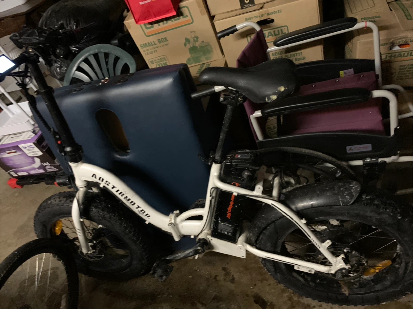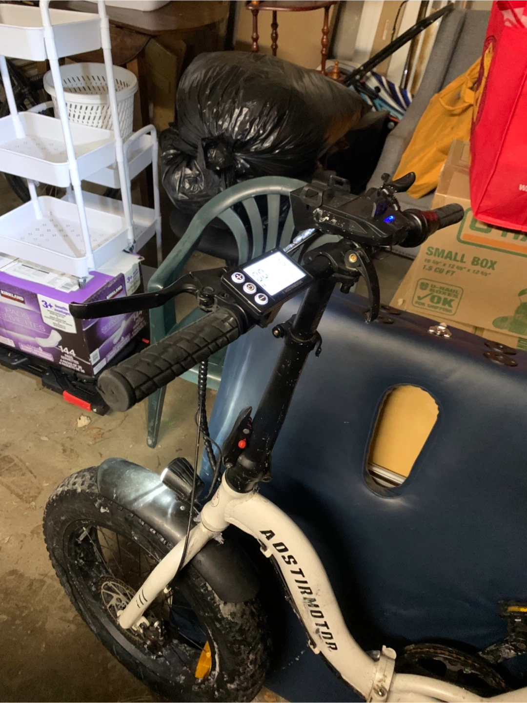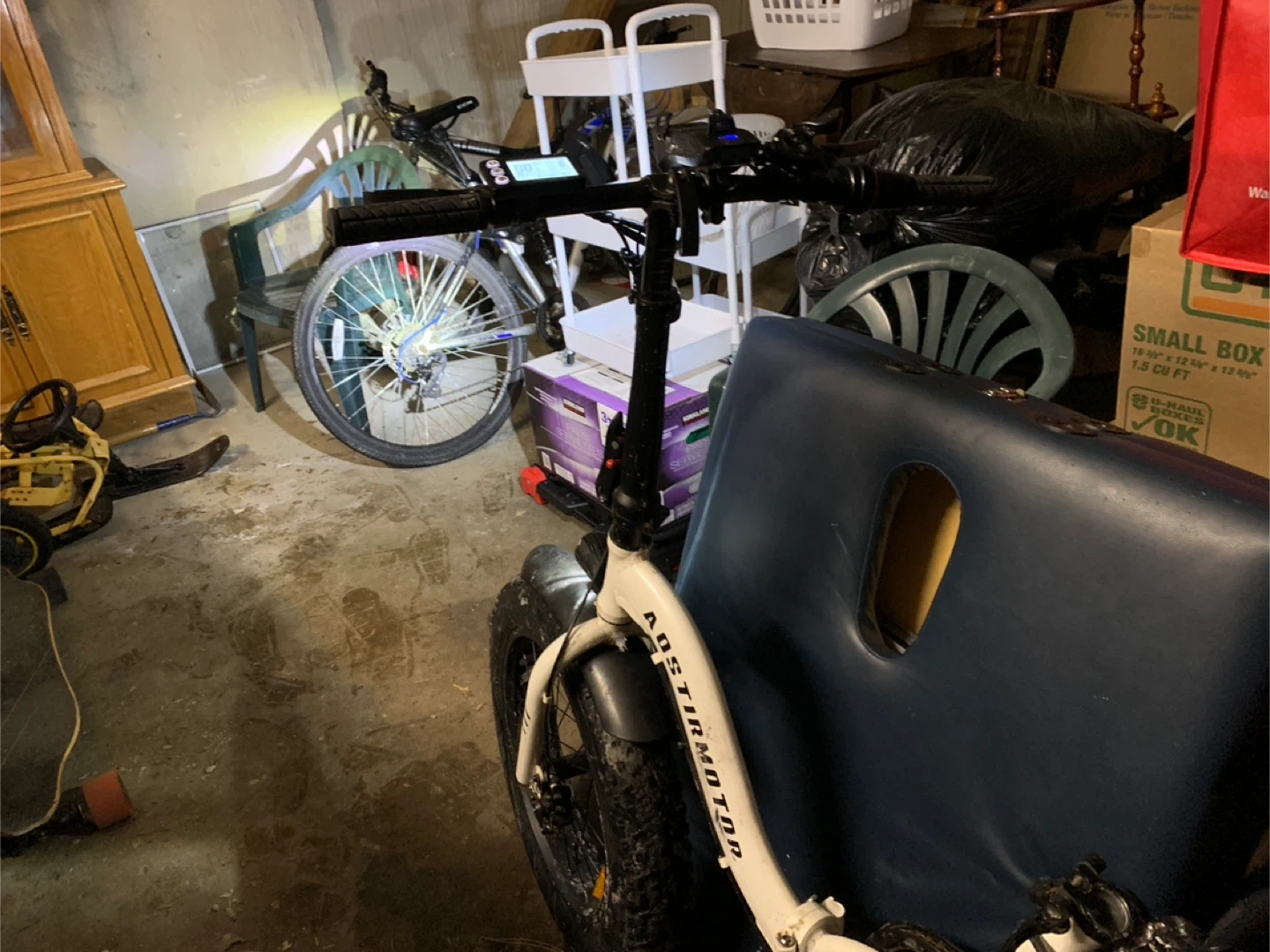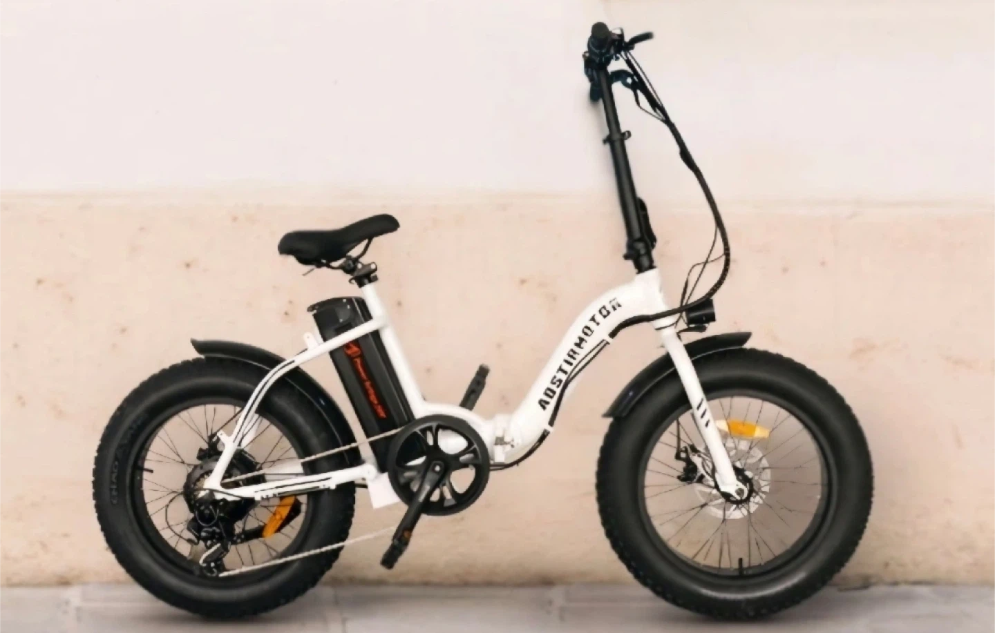 White Aostirmotor electric fat tire bike. Features a foldable frame for easy storage and transport. Comes with a rechargeable battery pack. This bike is great for various terrains!