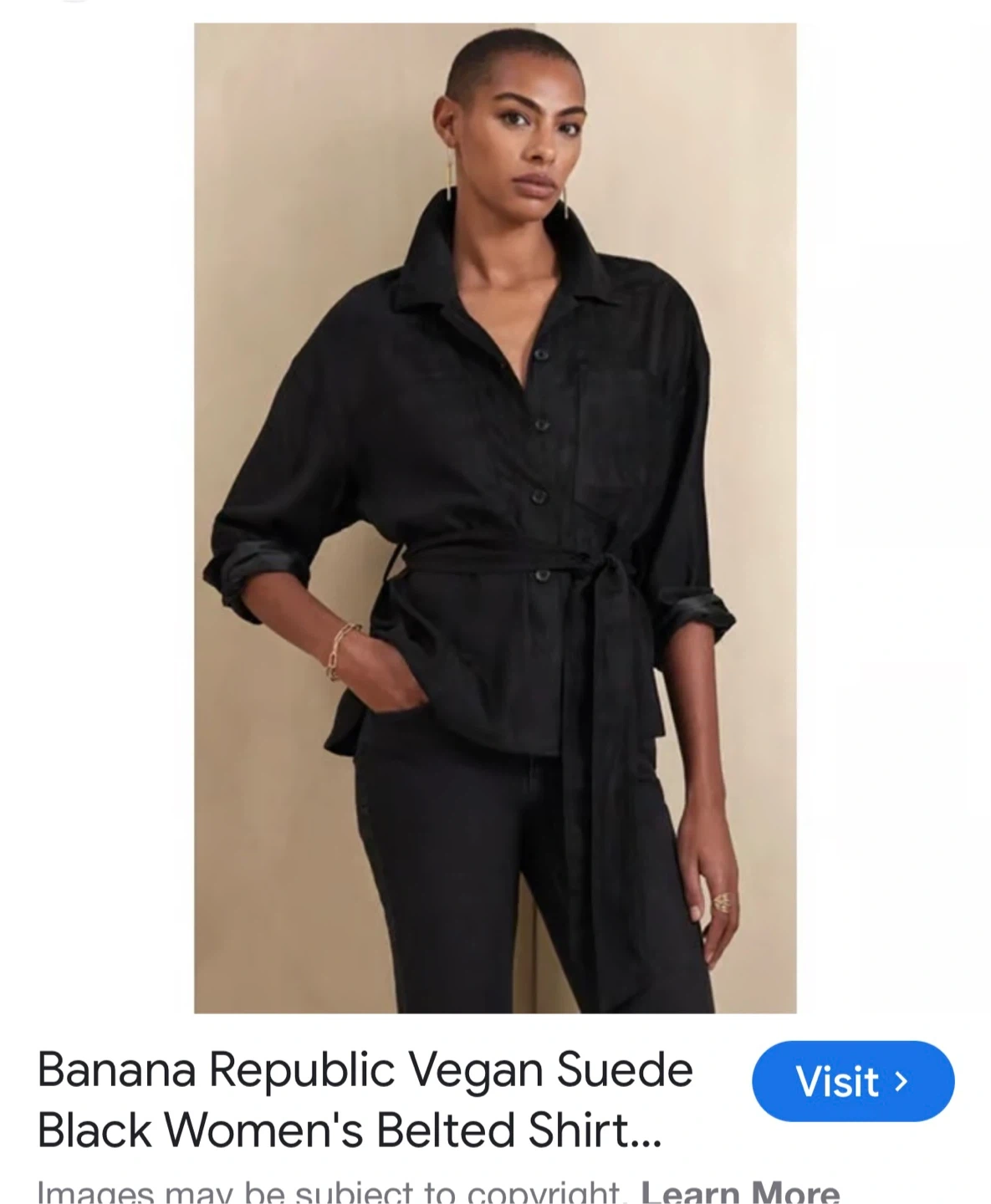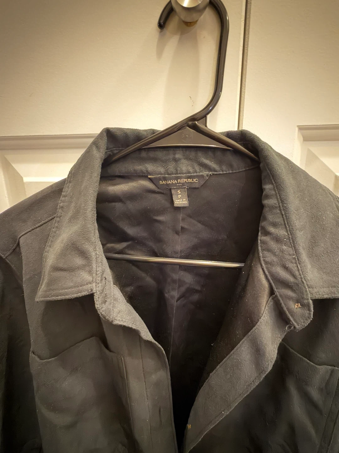 This Banana Republic belted shirt is made from black vegan suede. It's a size small. It comes with a matching tie belt.