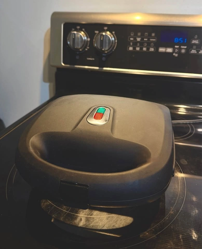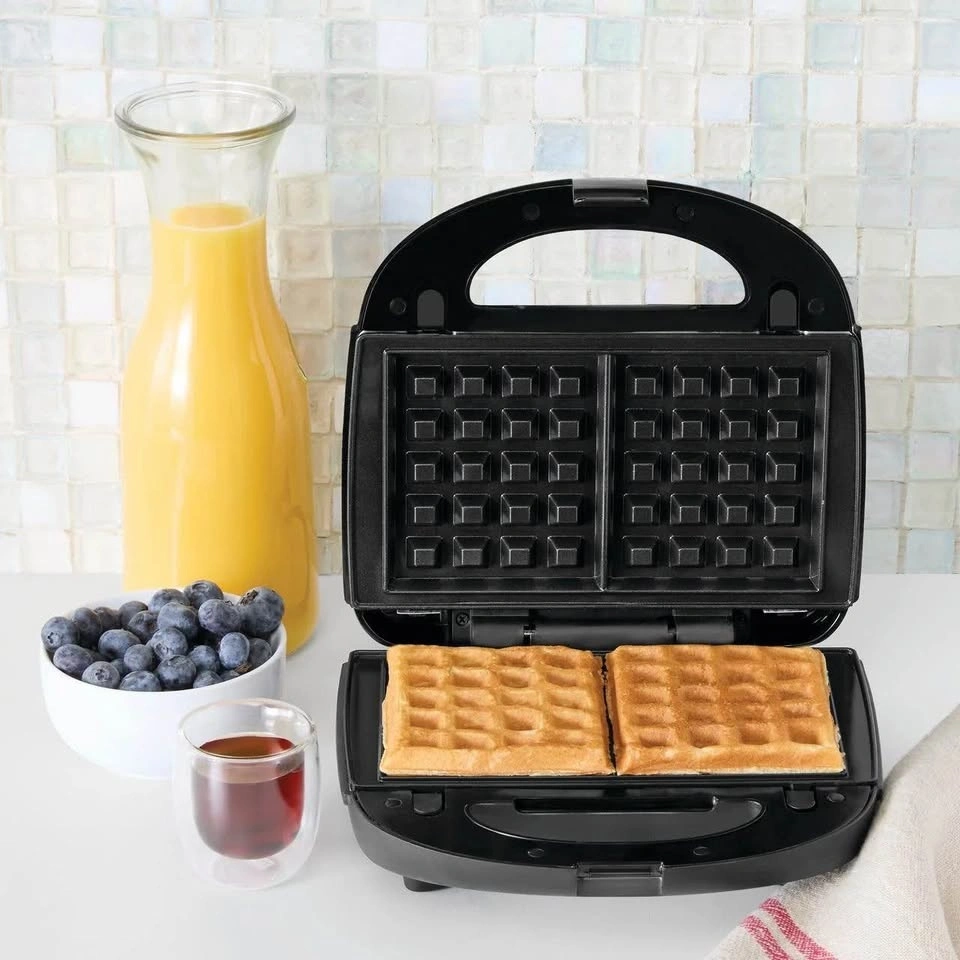 Selling a Mainstays 2-Slice Waffle and Sandwich Maker with removable plates. This is a great 750W kitchen tool that saves space by doing two jobs in one.