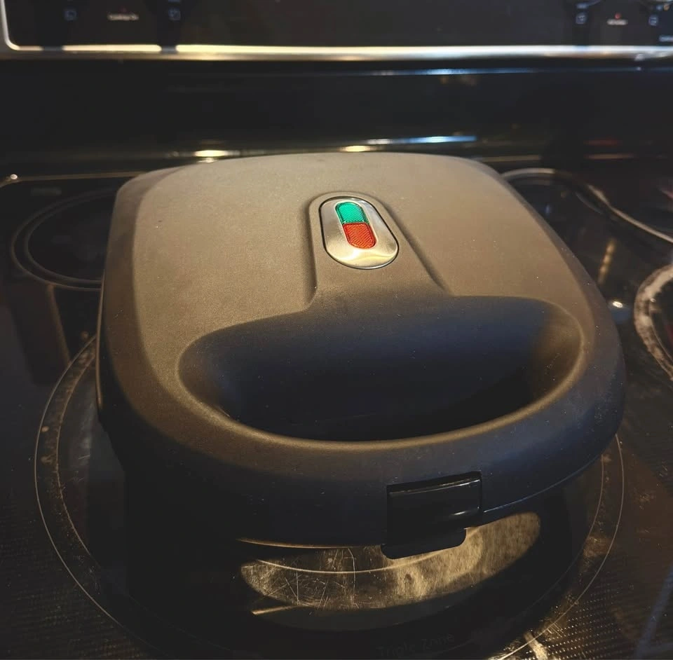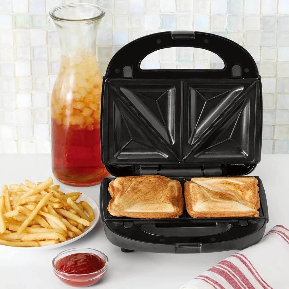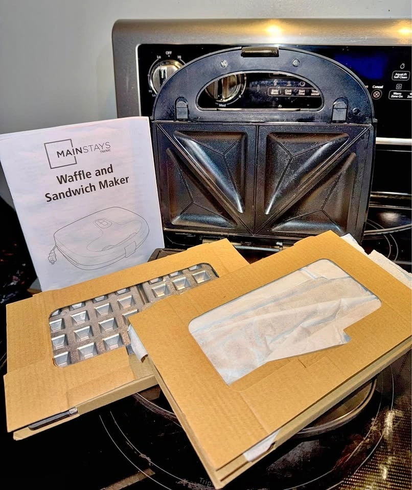 Selling a Mainstays 2-Slice Waffle and Sandwich Maker with removable plates. This is a great 750W kitchen tool that saves space by doing two jobs in one.