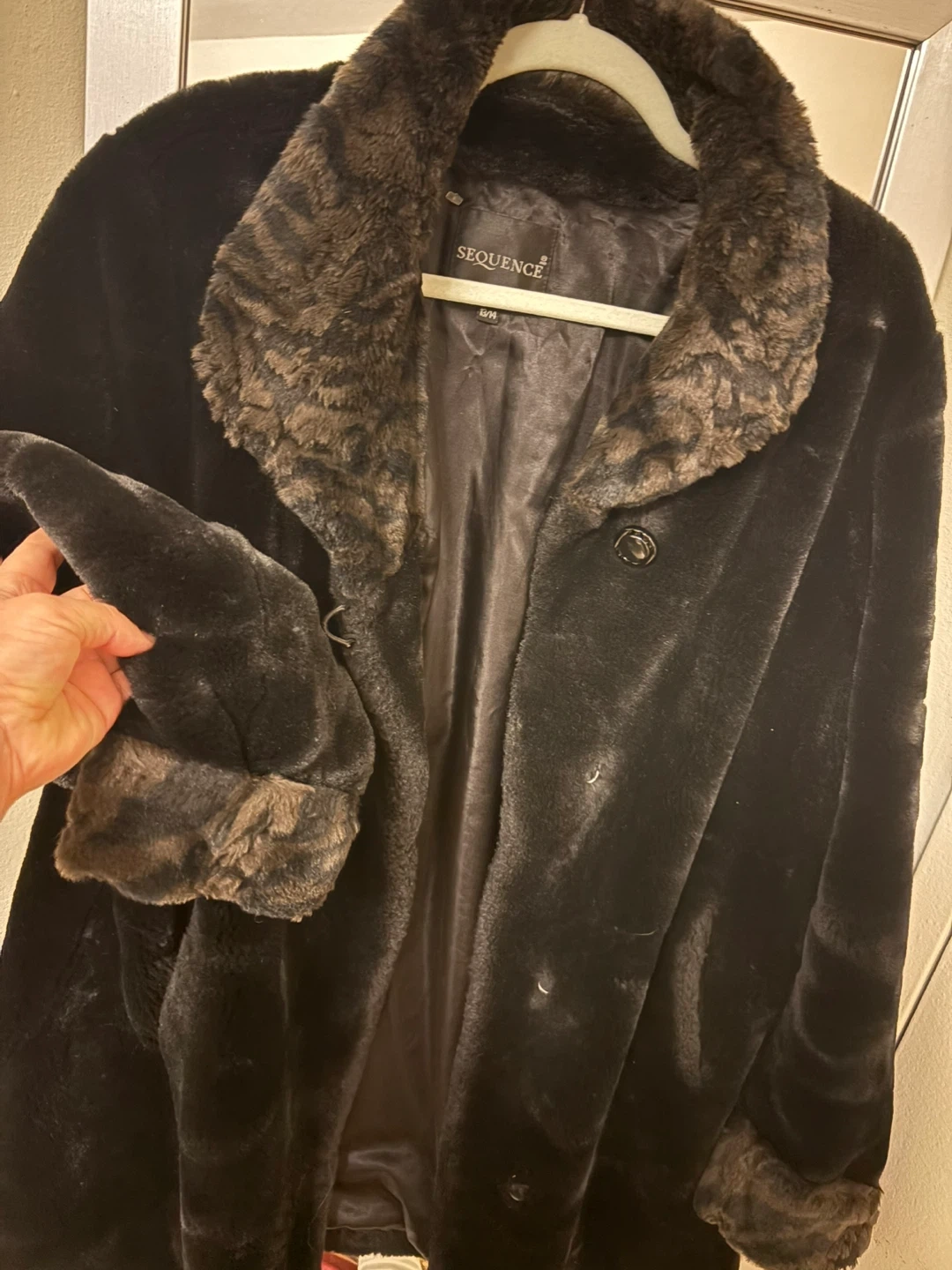 This black faux fur coat is from SEQUENCE. It features a cozy faux fur lining and trim with a matching leopard print scarf. It's perfect for staying warm and stylish during colder weather!