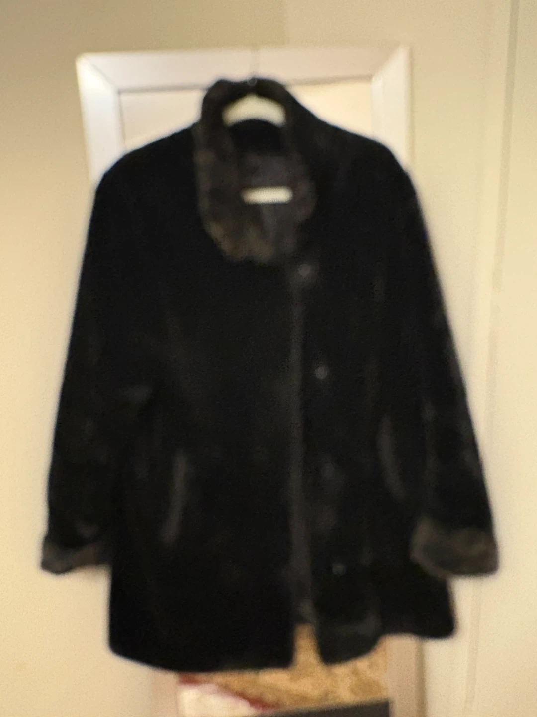 This black faux fur coat is from SEQUENCE. It features a cozy faux fur lining and trim with a matching leopard print scarf. It's perfect for staying warm and stylish during colder weather!