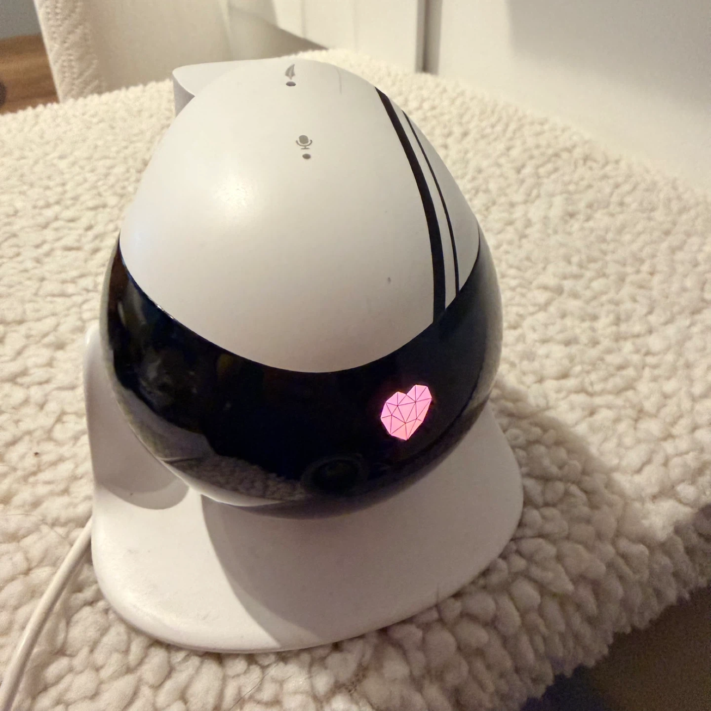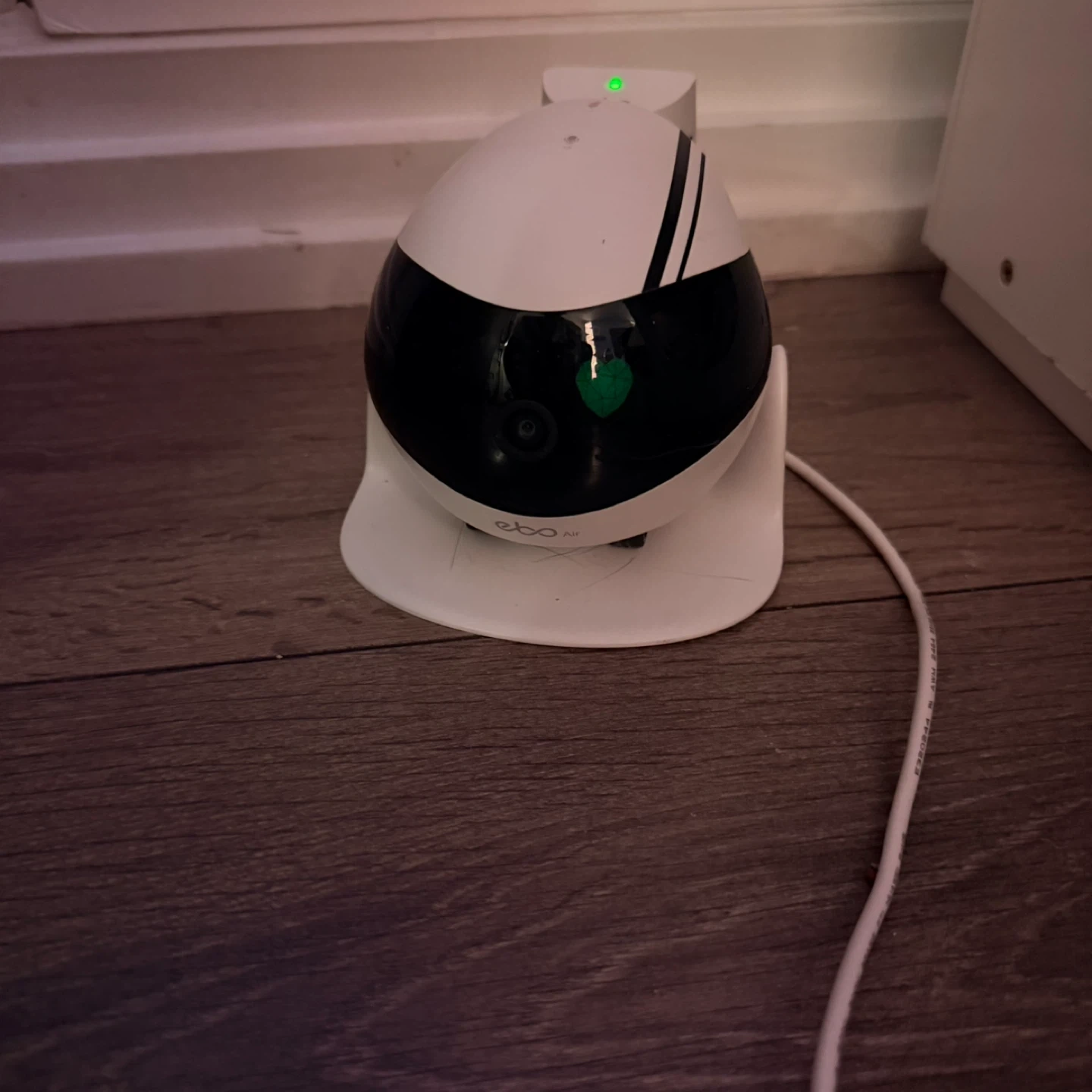 This is an Enabot EBO Air smart companion robot. It offers AI Smart Features, Smart Editing, Autonomous Obstacle & Avoidance Anti-Drop, and Automatic Self-Charging. It also includes a Pet Laser Pointer and 2-Way Communication with FHD video. This robot is designed as a Tumbler Design.