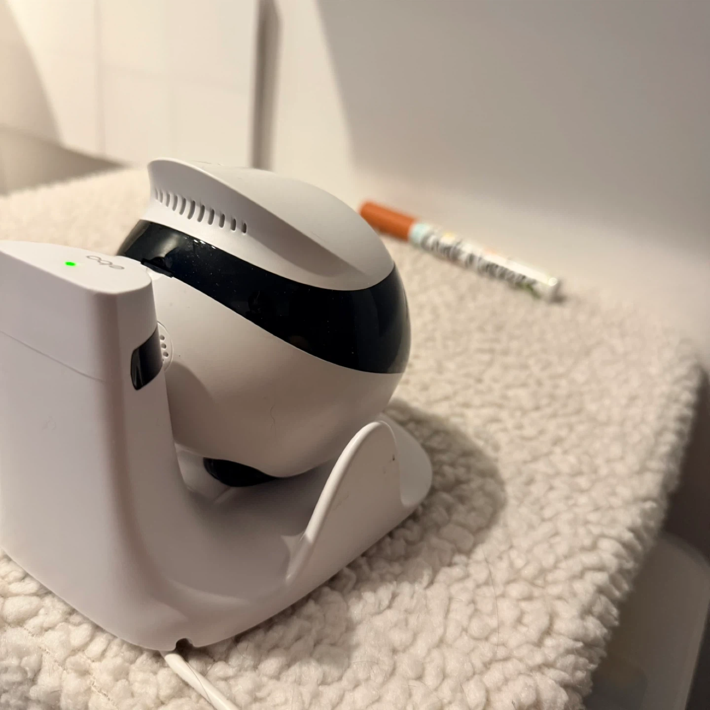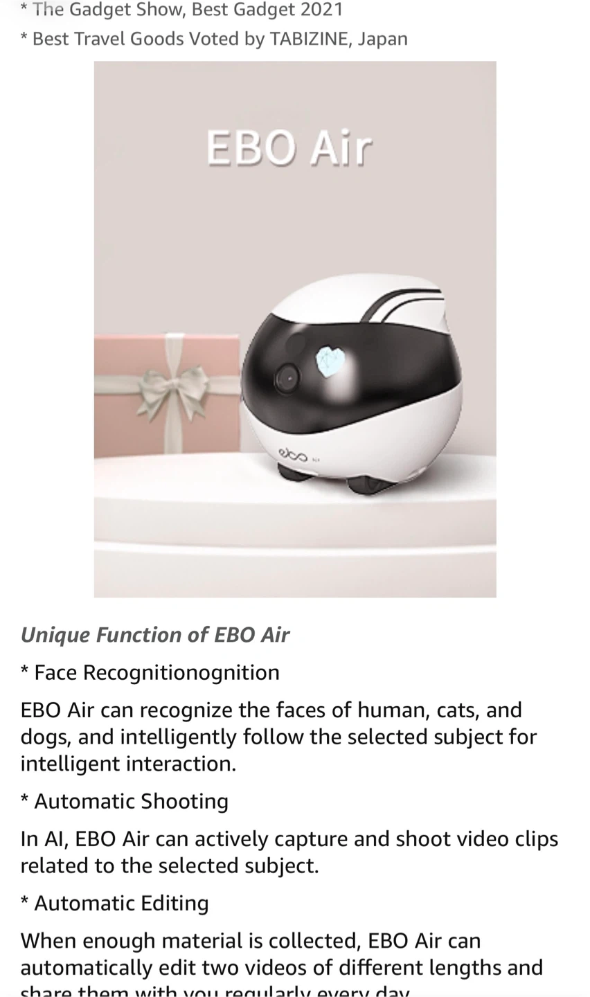 This is an Enabot EBO Air smart companion robot. It offers AI Smart Features, Smart Editing, Autonomous Obstacle & Avoidance Anti-Drop, and Automatic Self-Charging. It also includes a Pet Laser Pointer and 2-Way Communication with FHD video. This robot is designed as a Tumbler Design.