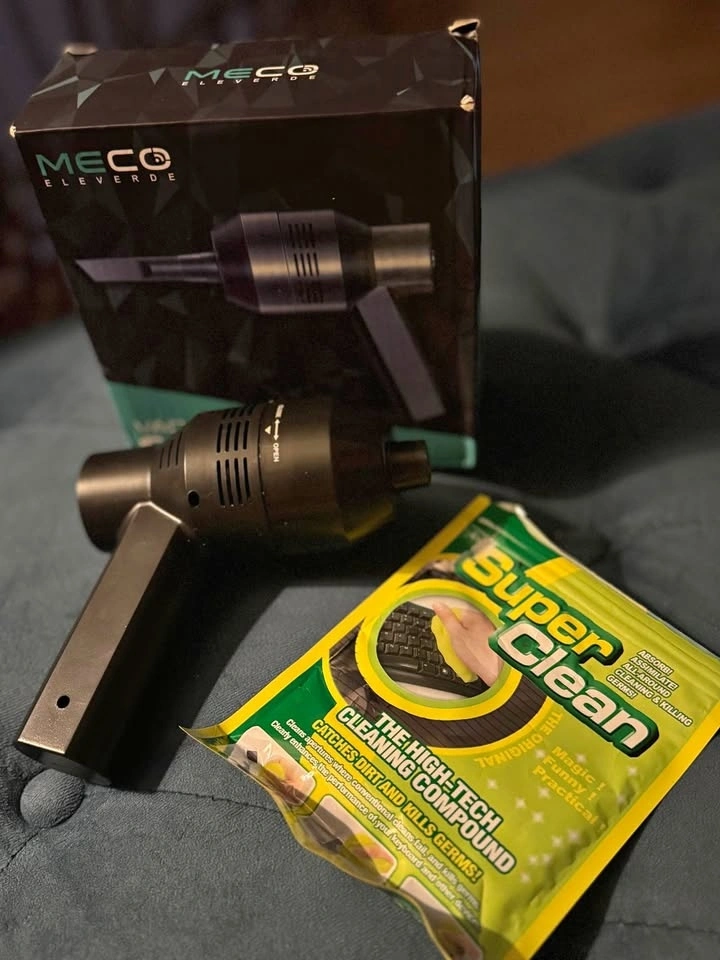 Like new. In box. Barely used. MECO Eleverde electric air duster for cleaning keyboards, laptops, electronics, and desk setups. Strong airflow without canned air. Rechargeable and reusable. Including a Super Clean cleaning gel for free, useful for picking up dust and debris from keyboards and tight spaces.