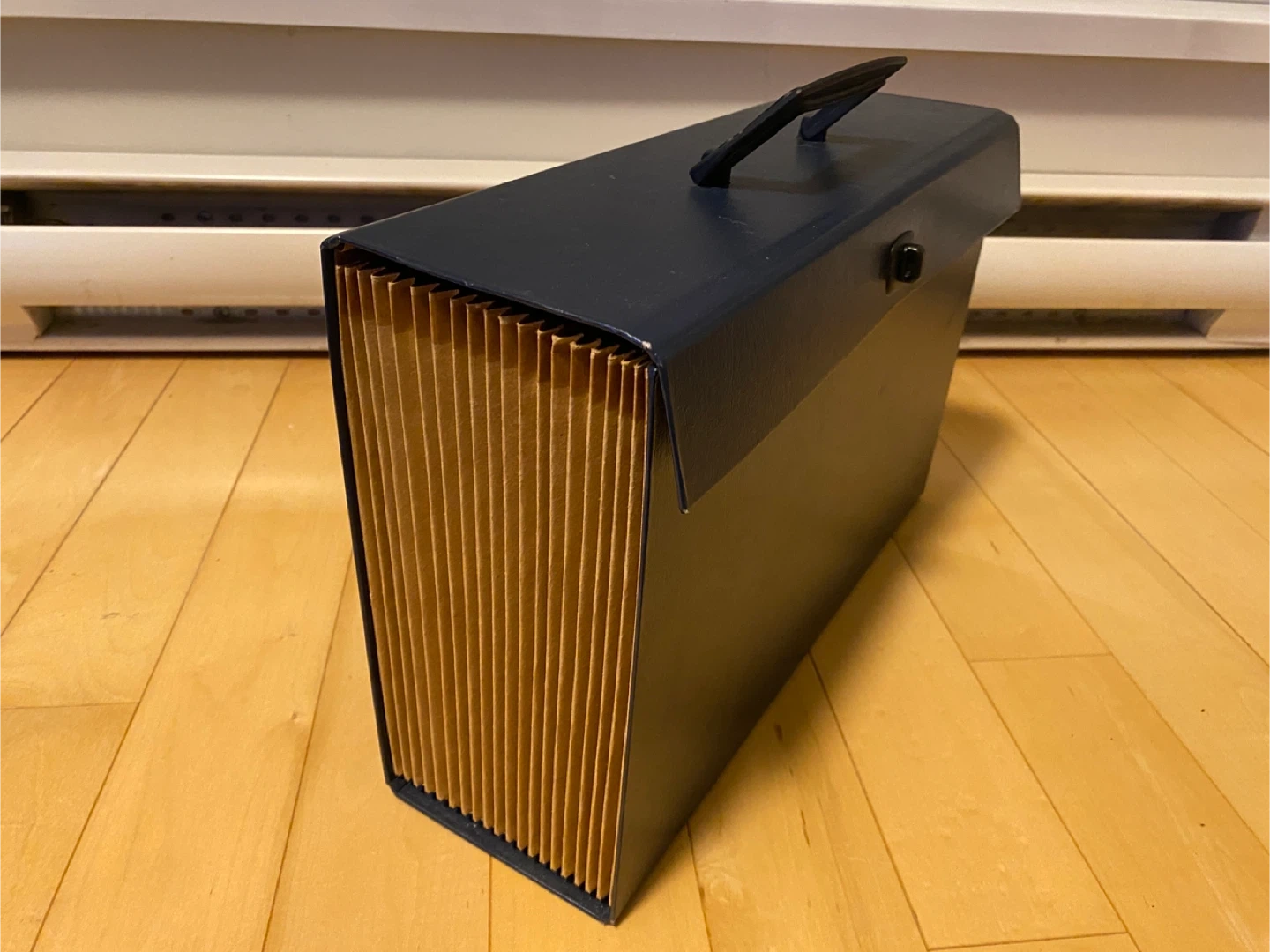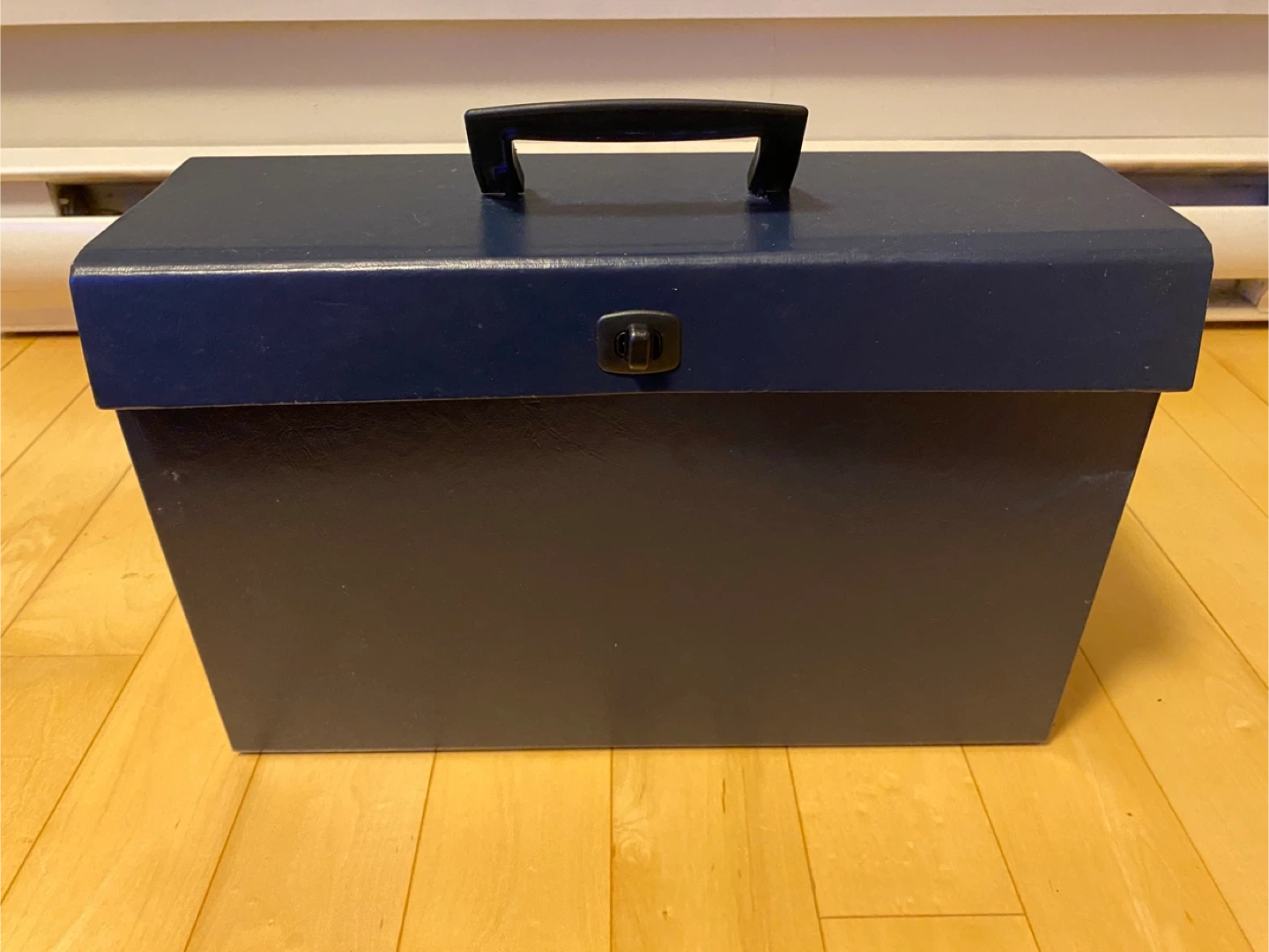 This is a dark blue accordion file organizer box. It features multiple labelled dividers for receipts, bills, and other important documents. It has a sturdy handle and a secure latch closure.