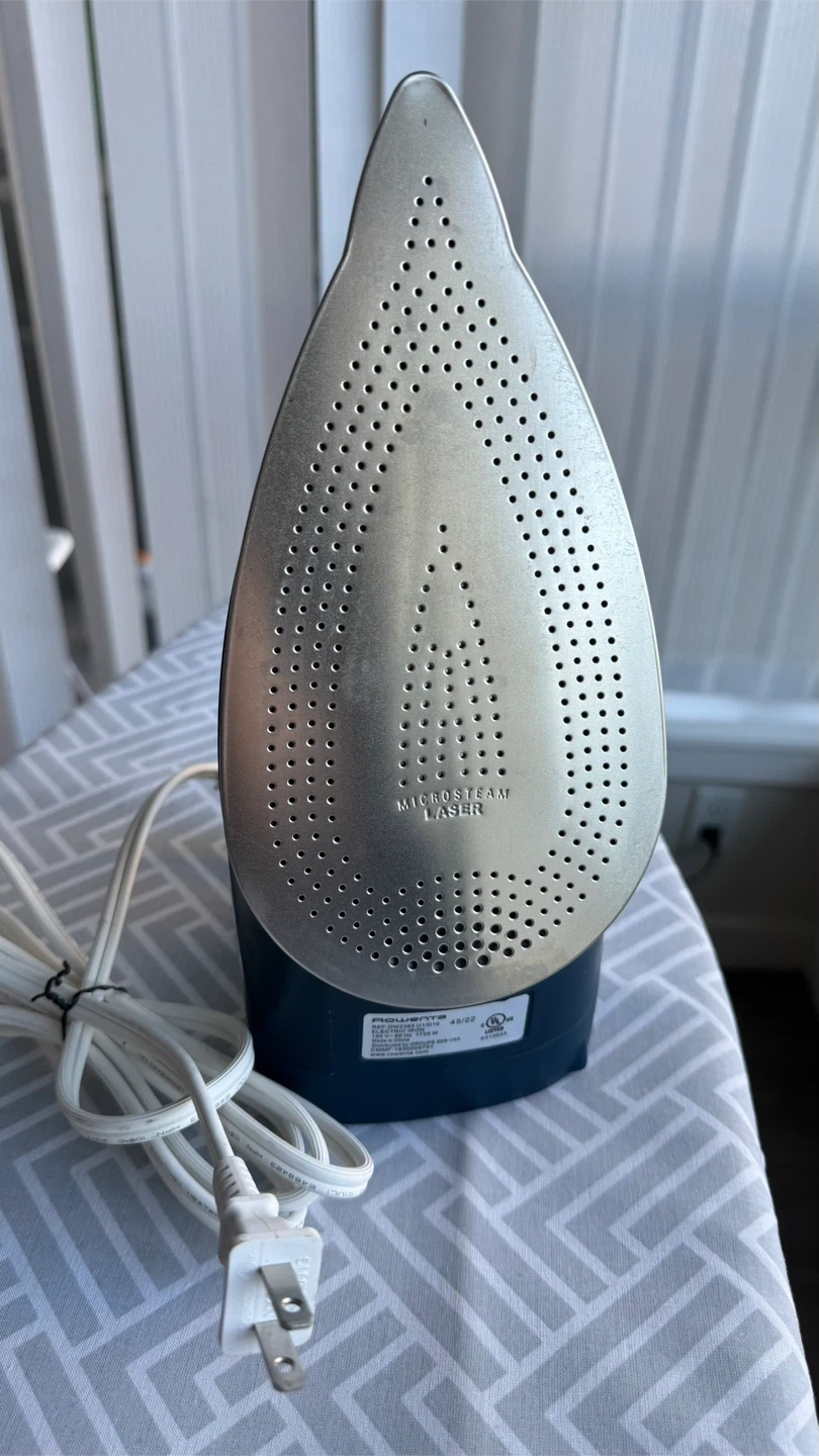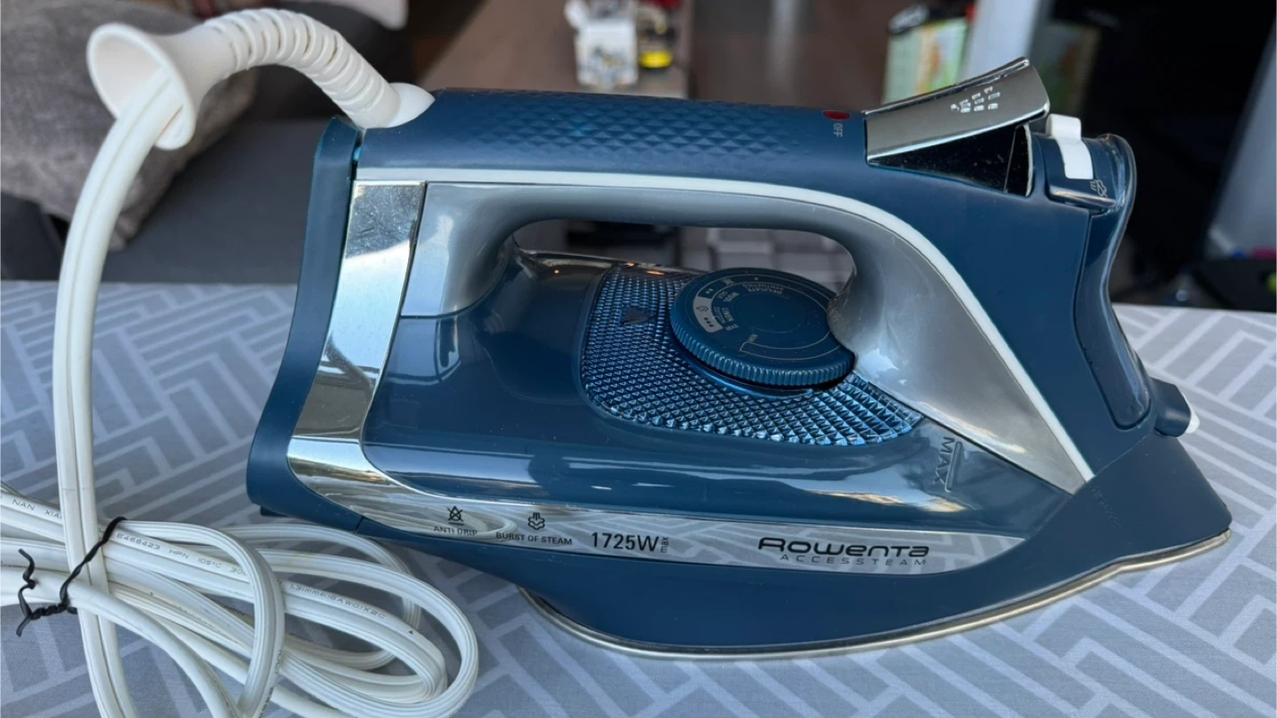 This is a steam iron from Rowenta, model 1720W, with a 1720W power output. It comes with a standard ironing board featuring a grey geometric pattern cover. Perfect for keeping your clothes looking sharp!