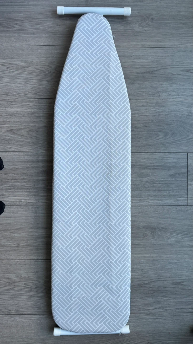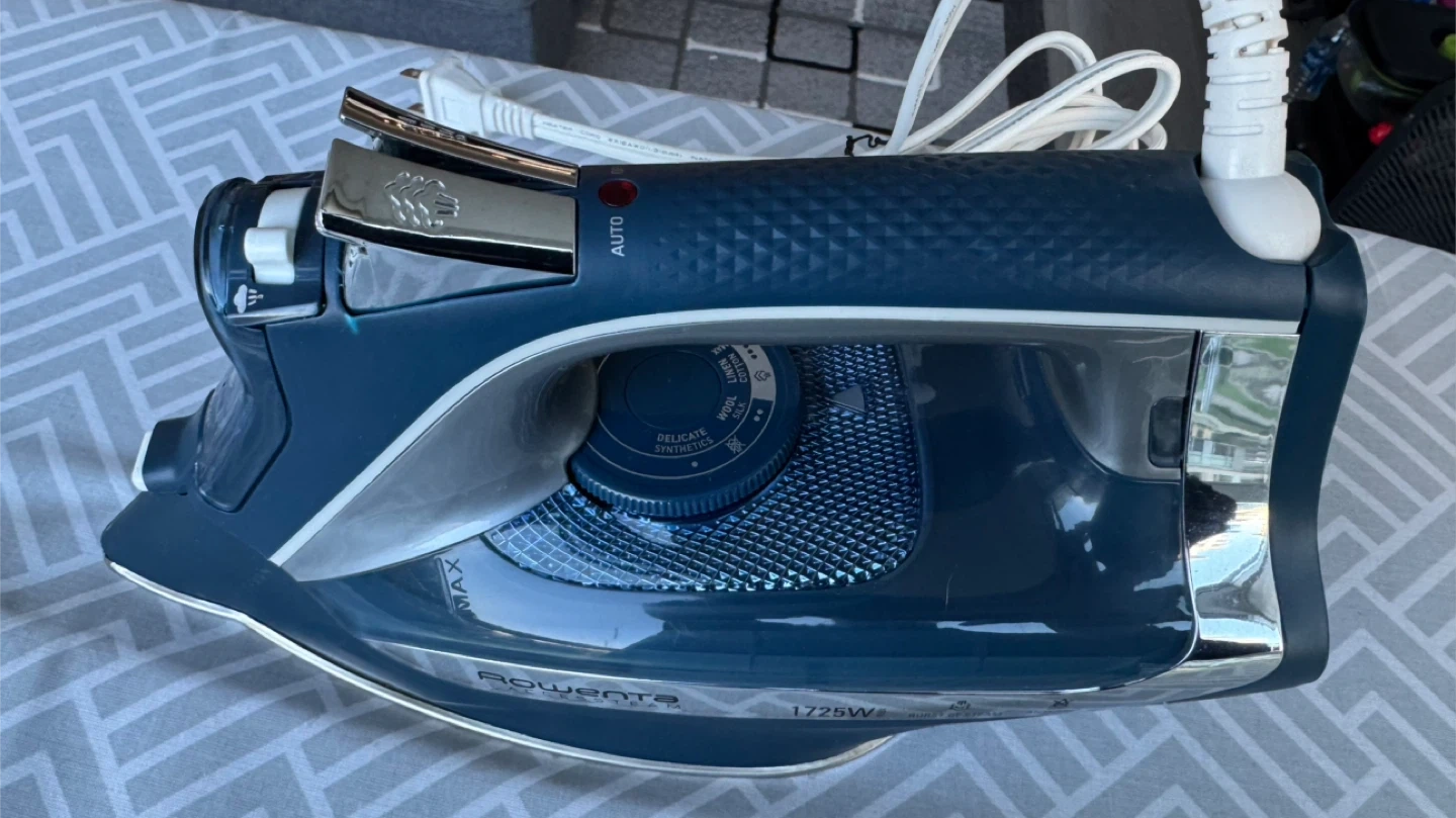 This is a steam iron from Rowenta, model 1720W, with a 1720W power output. It comes with a standard ironing board featuring a grey geometric pattern cover. Perfect for keeping your clothes looking sharp!