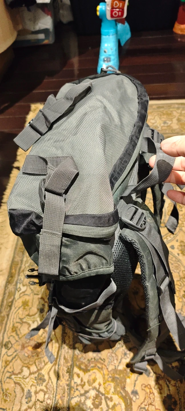 This SONADA backpack is designed for outdoor adventures. It's made of durable grey fabric with multiple compartments and adjustable straps. This pack is great for carrying gear on long hikes or trips!