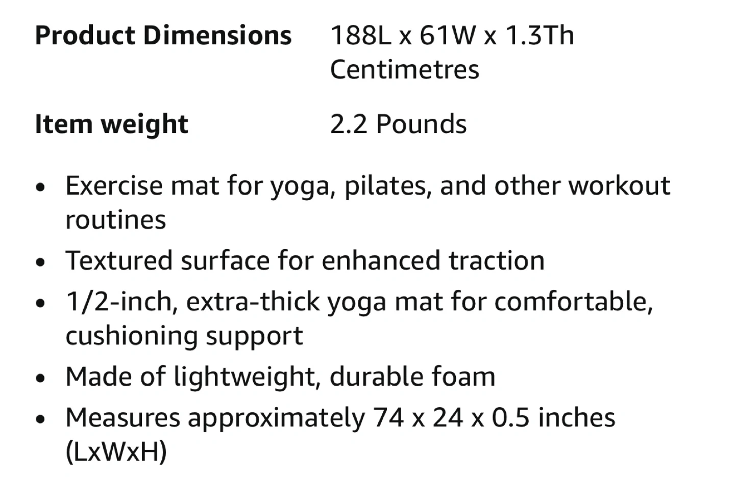 This HEAD yoga mat is 188cm long and 61cm wide, with a 1.3cm thickness. It's made of lightweight, durable foam and features a textured surface for traction. It offers comfortable cushioning support for yoga and other workouts.