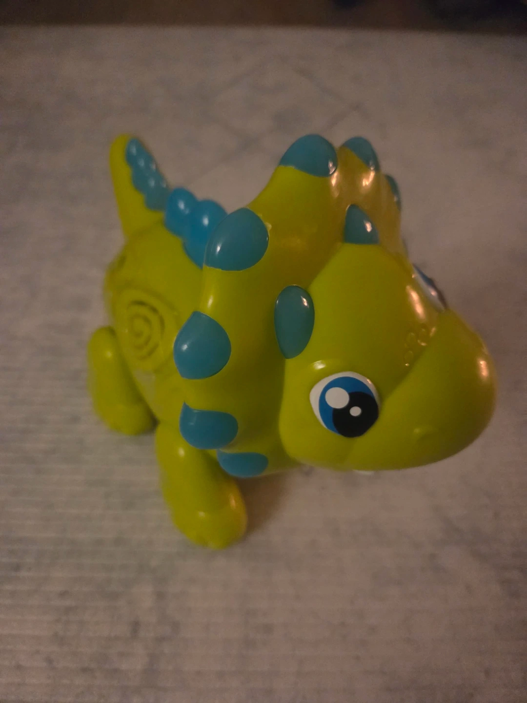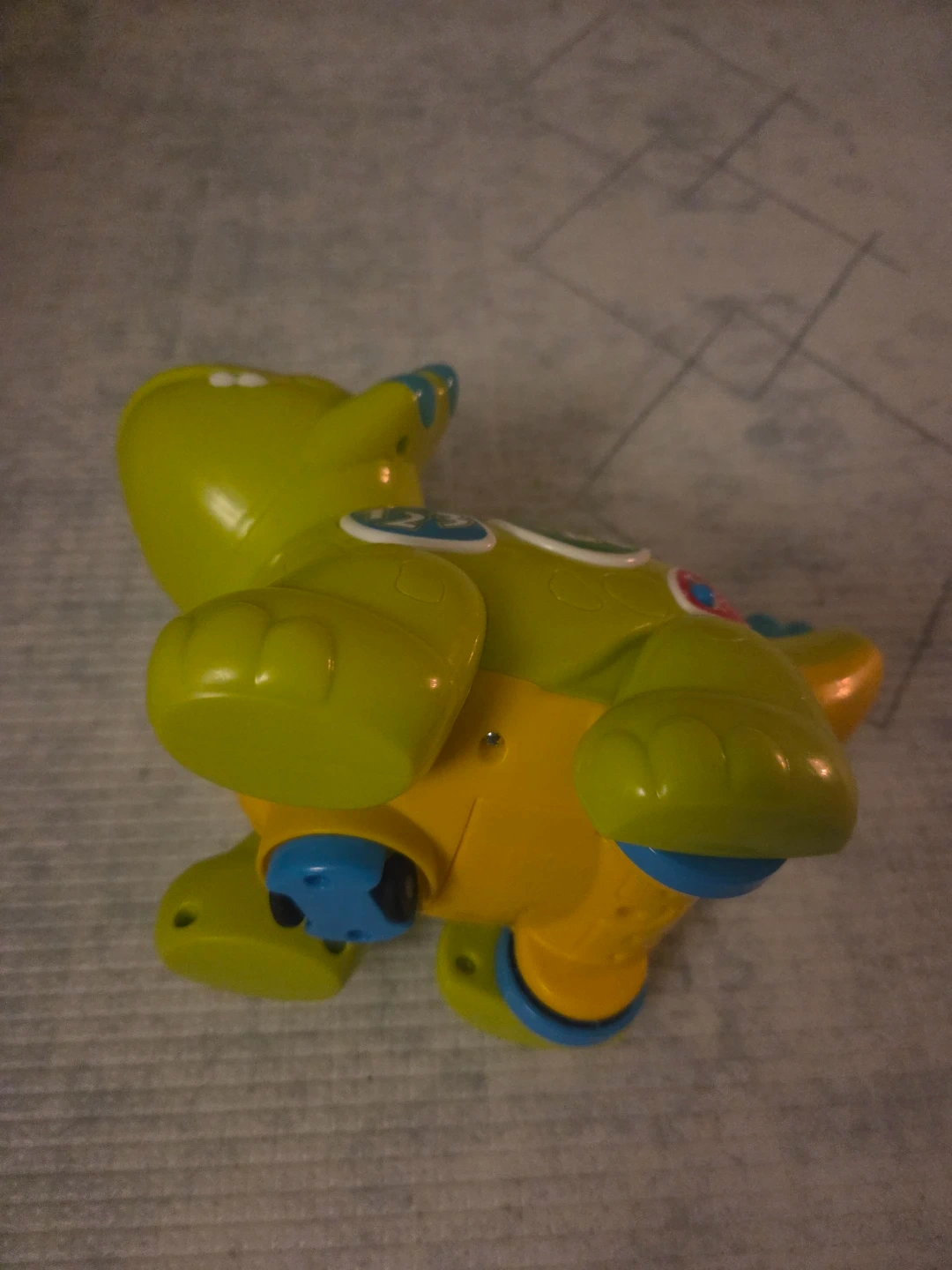 This is a bright green toy dinosaur with blue accents. It has buttons with numbers 123 and ABC on its side. It's a fun educational toy for little ones!