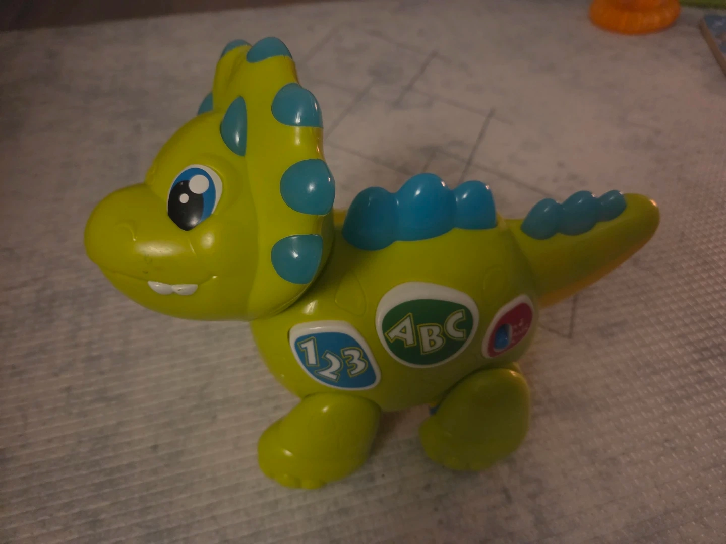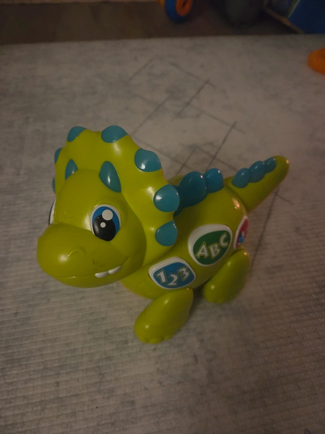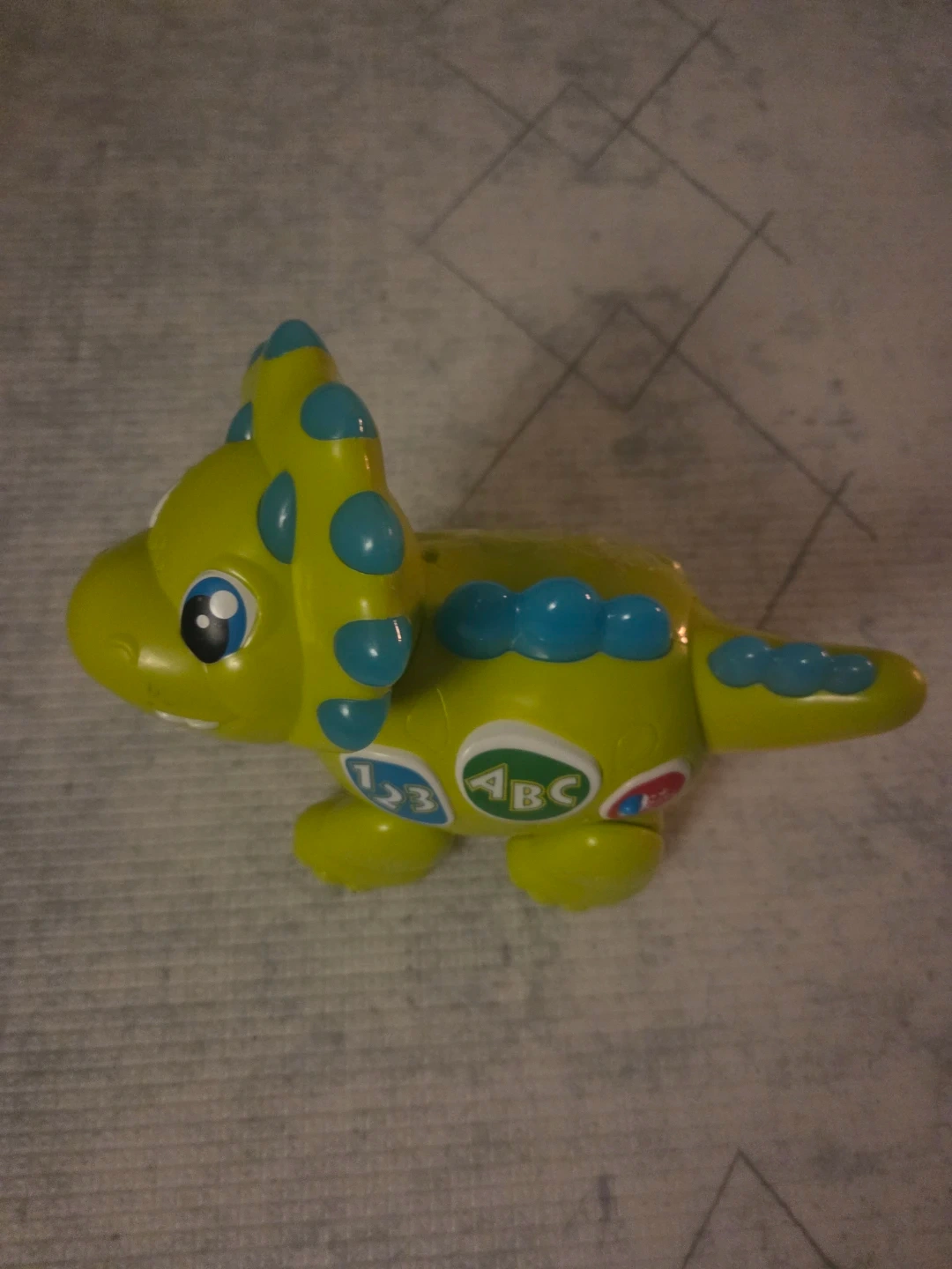 This is a bright green toy dinosaur with blue accents. It has buttons with numbers 123 and ABC on its side. It's a fun educational toy for little ones!