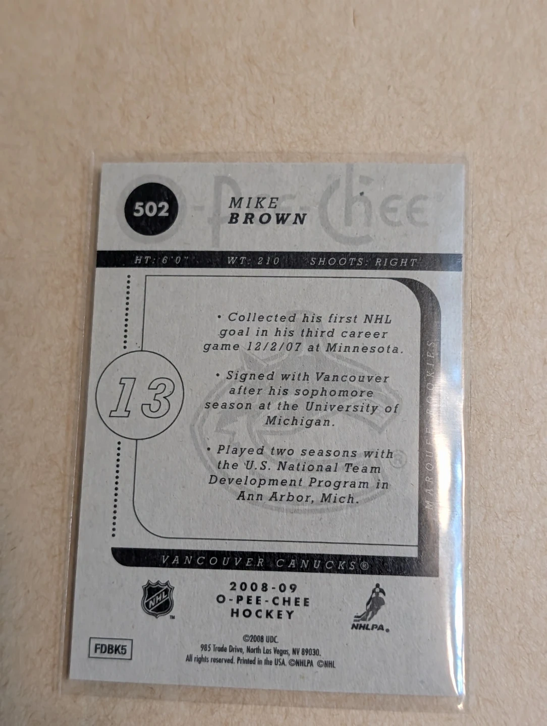 This is a 2008-09 O-Pee-Chee Marquee Rookies hockey card featuring Mike Brown of the Vancouver Canucks. It highlights his NHL career milestones. Collected his first NHL goal in his third career game at Minnesota.