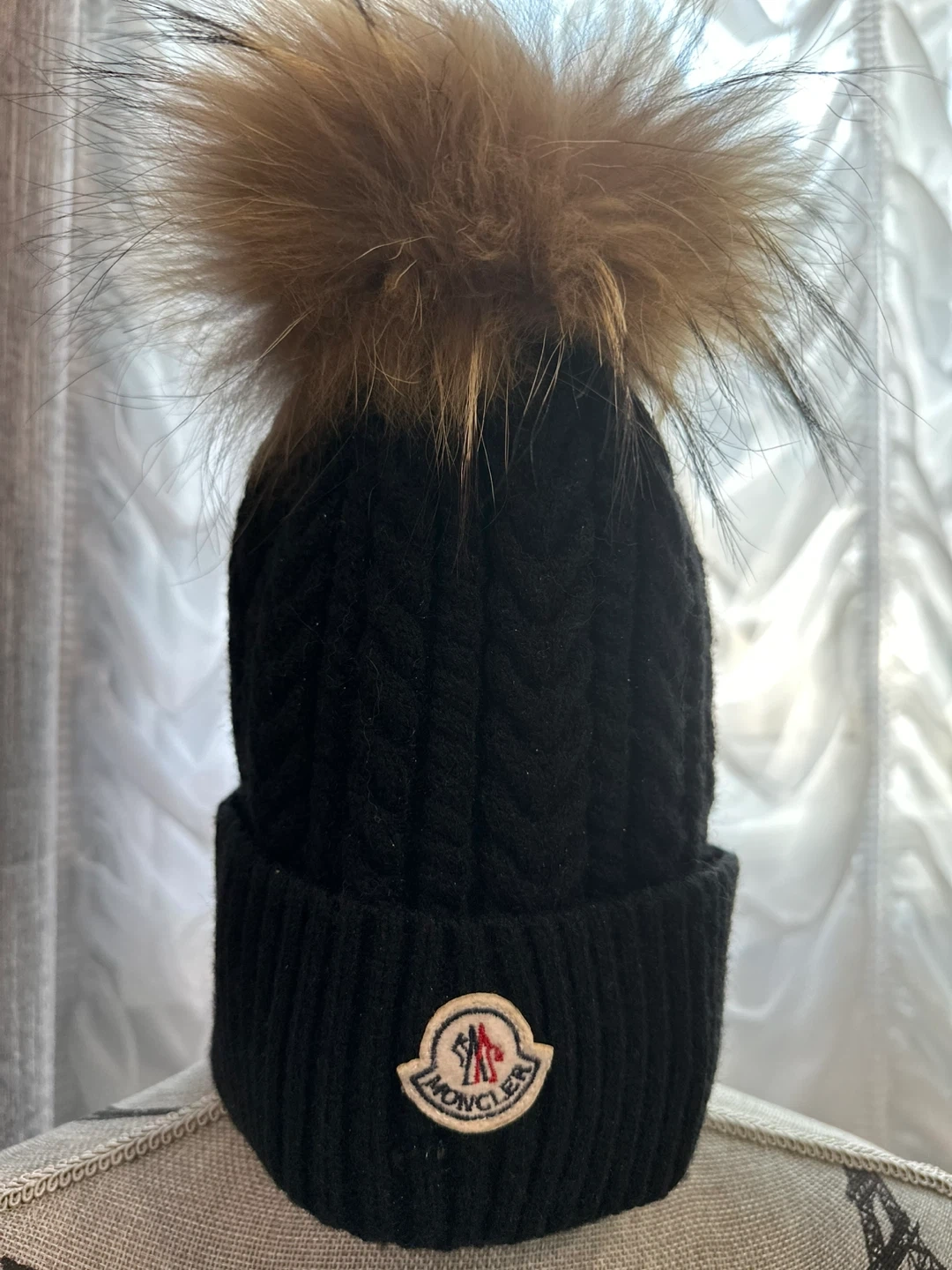 A black knitted beanie from Moncler with a fluffy pom. It's made with quality materials for warmth. Great for keeping cozy on chilly days!