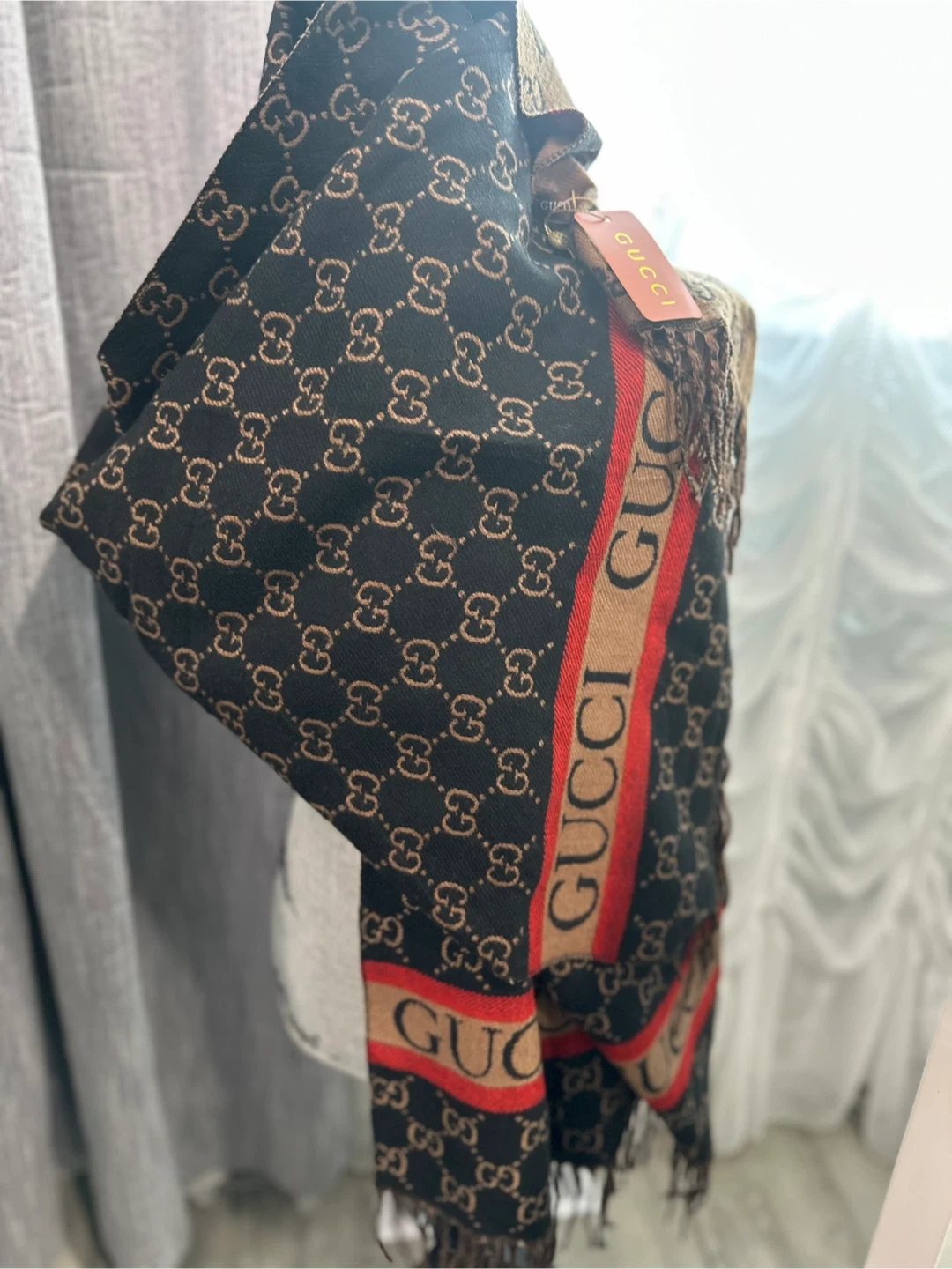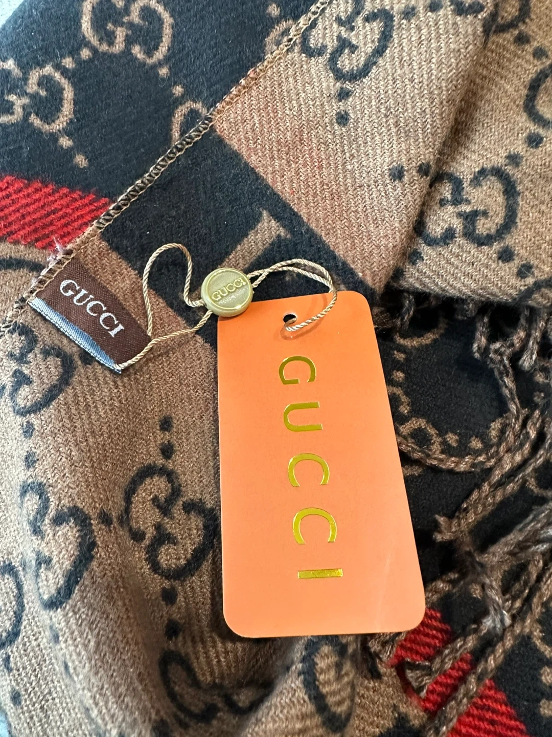 This is a Gucci scarf with the iconic GG logo pattern. It features fringed edges and a striped detail with the Gucci name. Material appears to be a blend suitable for warmth and style.