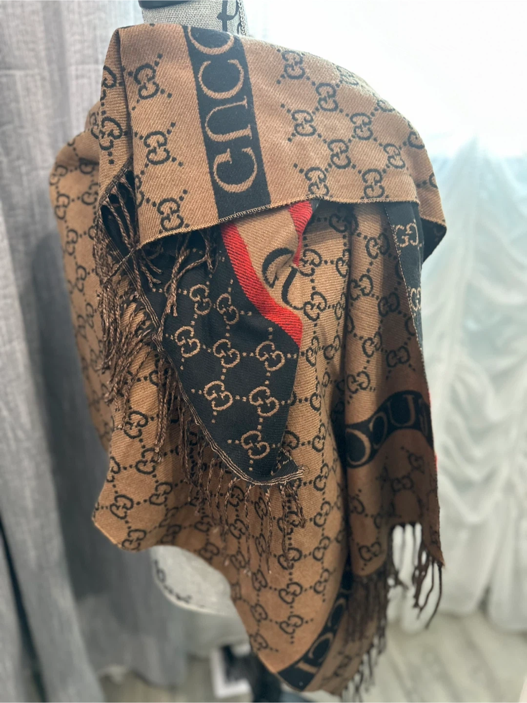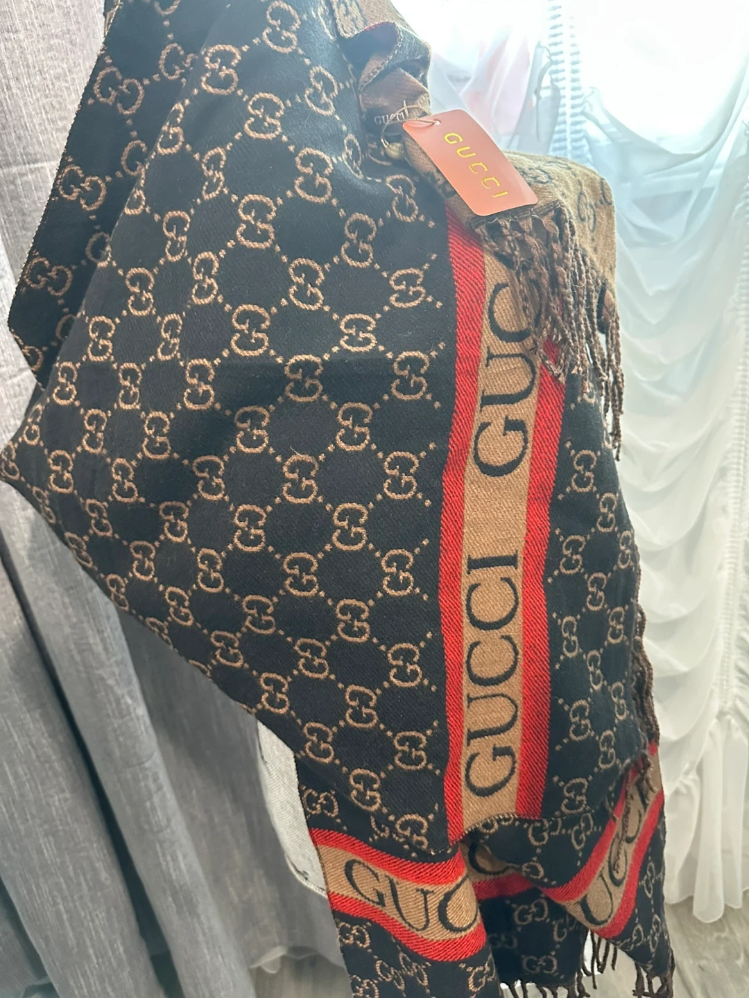 This is a Gucci scarf with the iconic GG logo pattern. It features fringed edges and a striped detail with the Gucci name. Material appears to be a blend suitable for warmth and style.