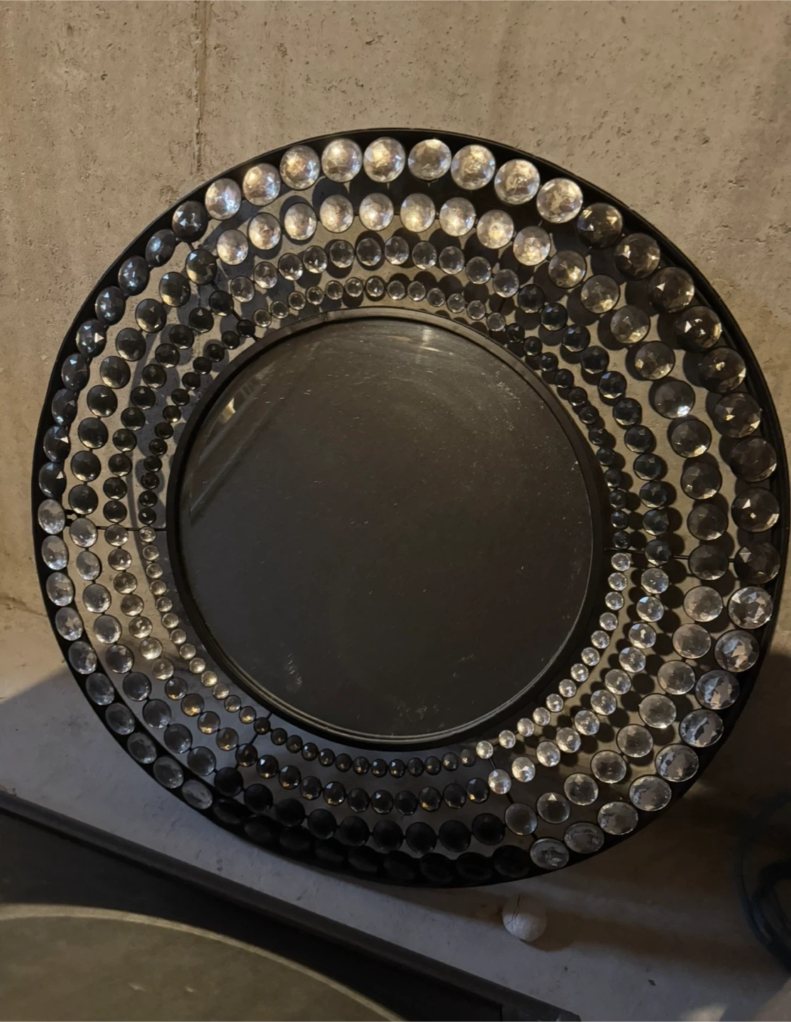 A round mirror with a black frame, generously decorated with clear and dark rhinestones. It's a lovely accent piece for any room. The mirror itself has a diameter of approximately 8 inches.