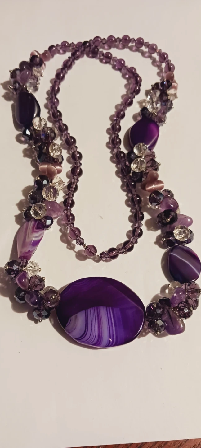 This unique necklace features multiple strands of purple beads in various sizes and shapes. It's accented with clear crystals and a large oval agate pendant. The necklace is crafted with a mix of polished and rough-cut stones. 28" long. Excellent condition. ALL MY PRICES ARE NEGOTIABLE !!