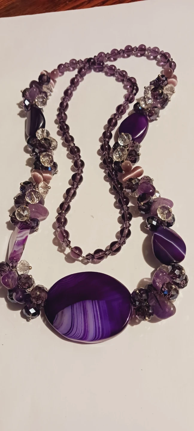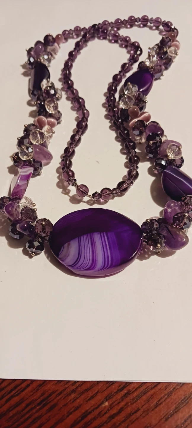 This unique necklace features multiple strands of purple beads in various sizes and shapes. It's accented with clear crystals and a large oval agate pendant. The necklace is crafted with a mix of polished and rough-cut stones. 28" long. Excellent condition. ALL MY PRICES ARE NEGOTIABLE !!