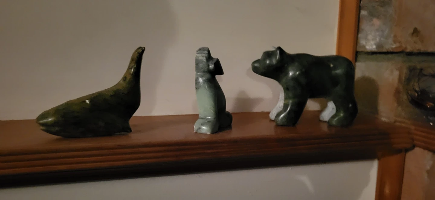 These are three small stone animal figurines, including a seal, a dog, and a bear. They're carved from a dark green soap stone with some lighter veining. They're quite decorative!