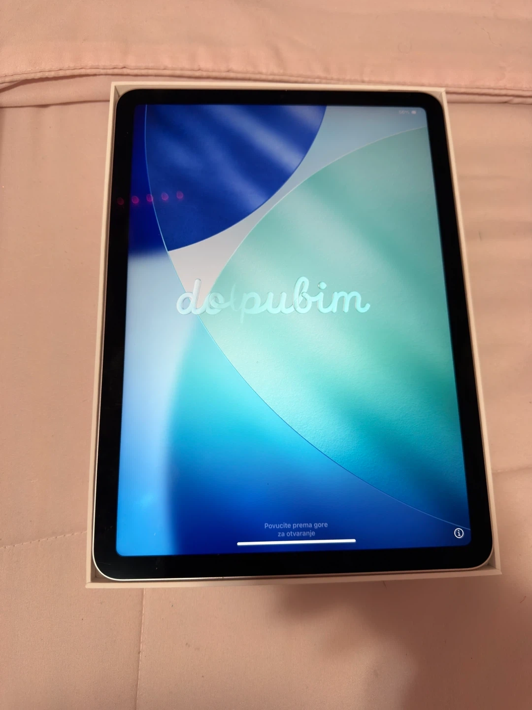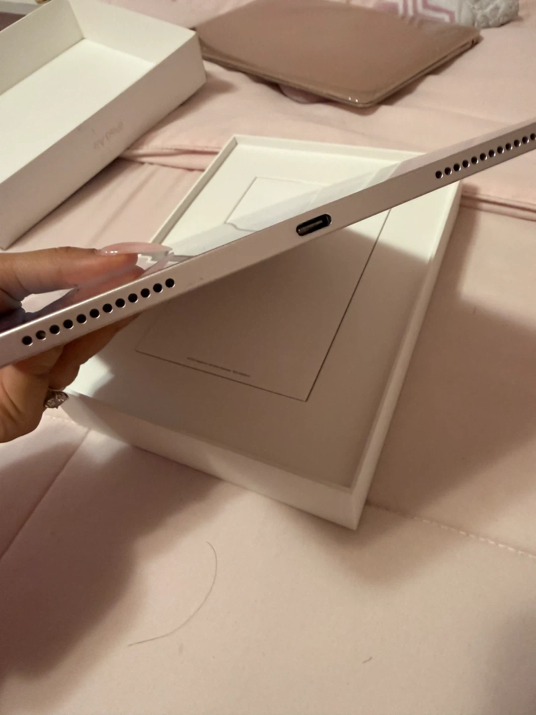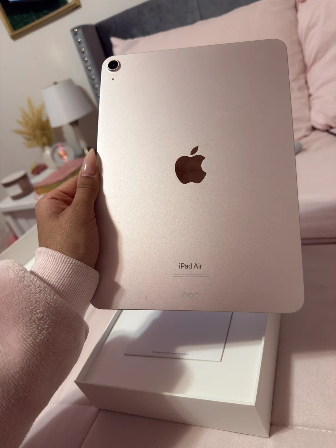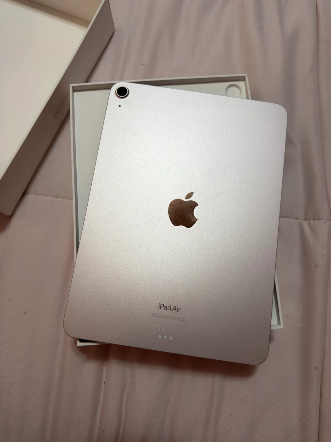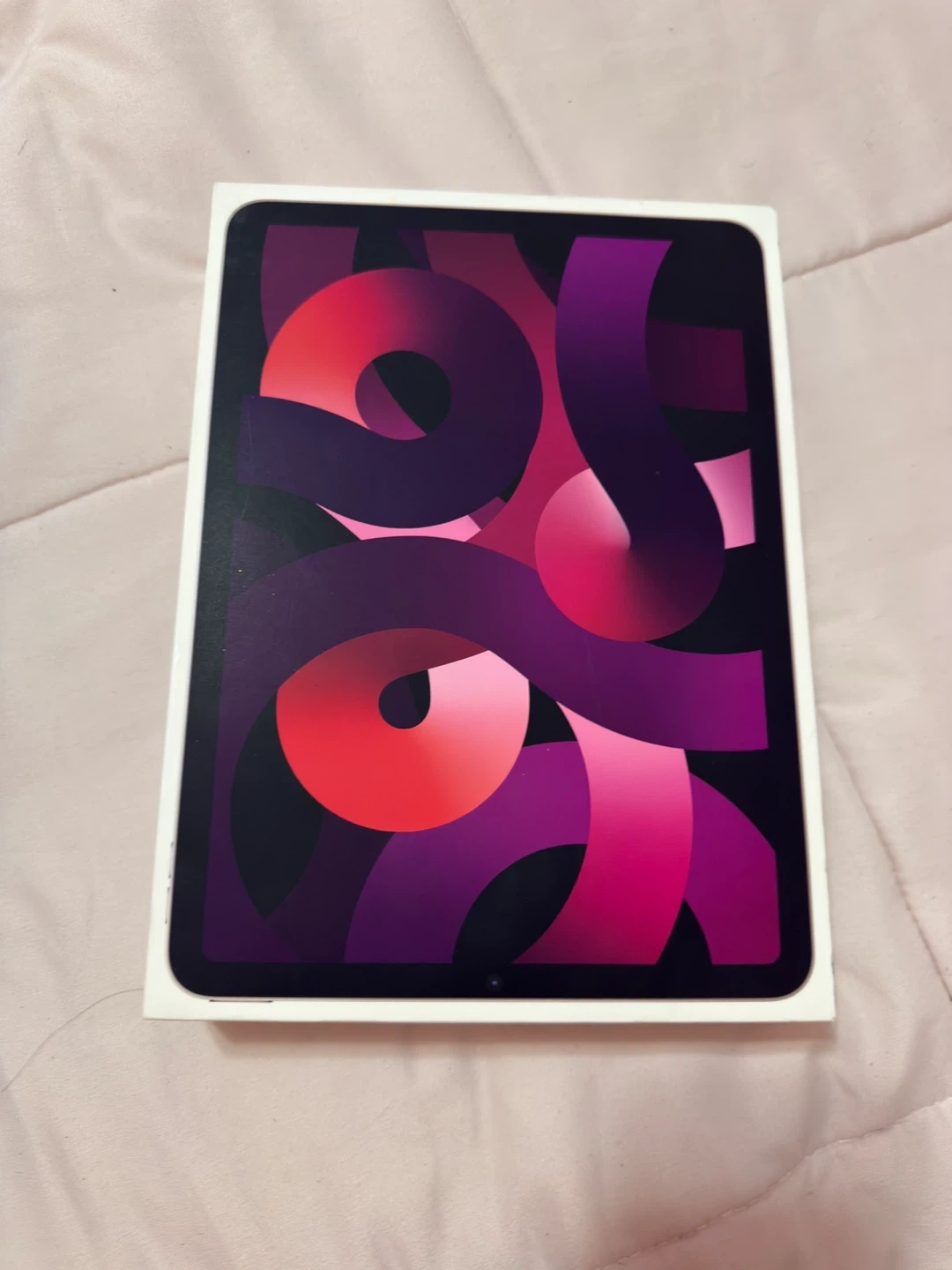 This is an Apple iPad Air (5th Generation) Wi-Fi model with 64GB of storage in pink. It includes the iPad, a USB-C Charge Cable, and a USB-C Power Adapter. It's in its original packaging.