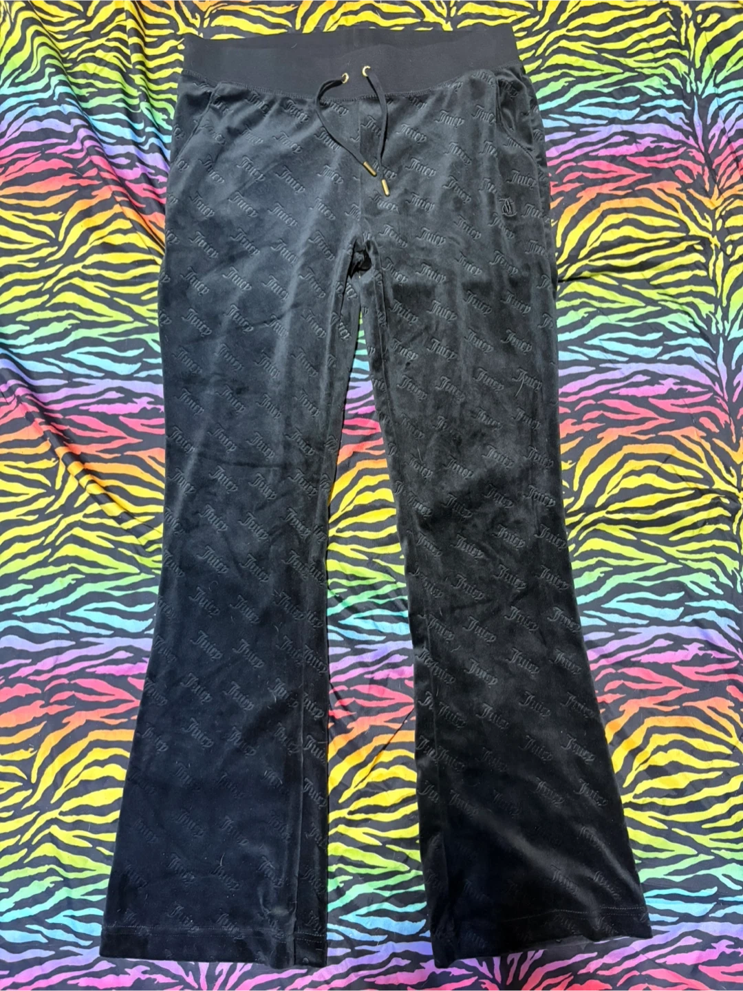 Black velour flare pants by Juicy Couture Sport. These pants are size large and feature an all-over embossed Juicy Couture logo pattern. They have a drawstring waist with gold hardware.