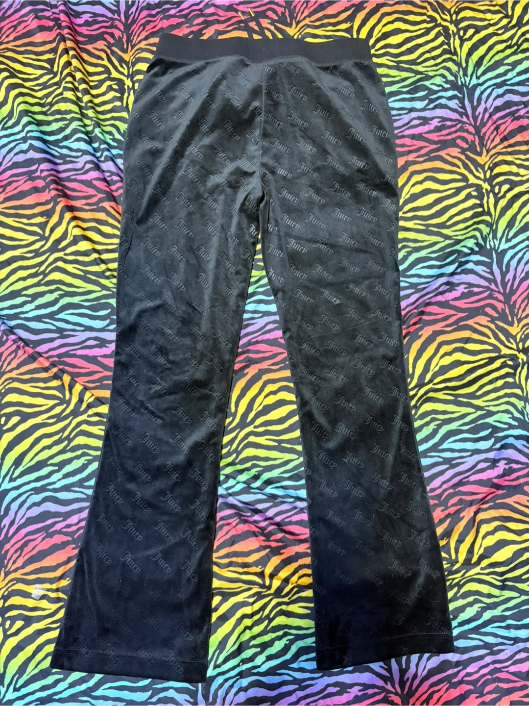 Black velour flare pants by Juicy Couture Sport. These pants are size large and feature an all-over embossed Juicy Couture logo pattern. They have a drawstring waist with gold hardware.