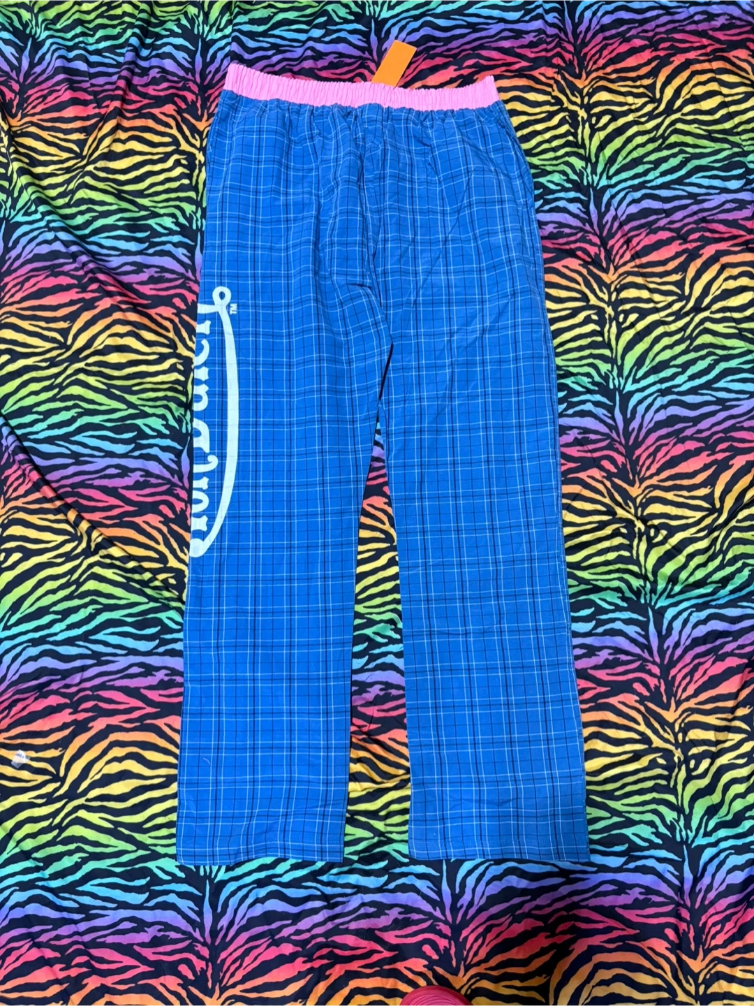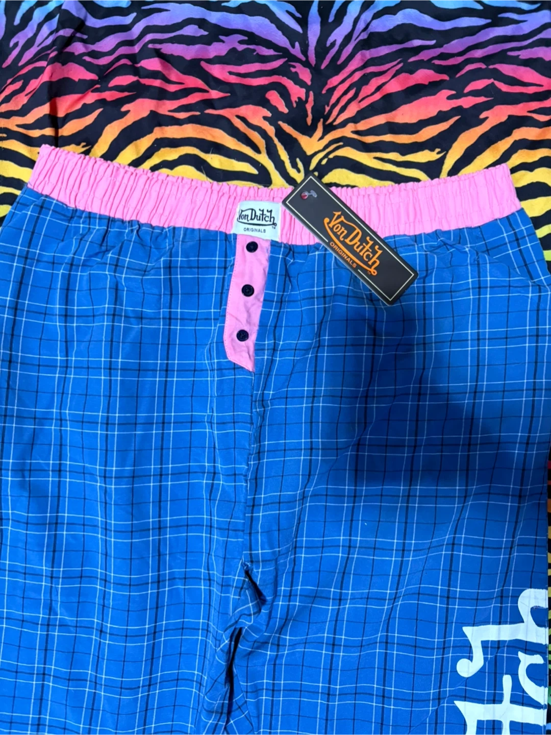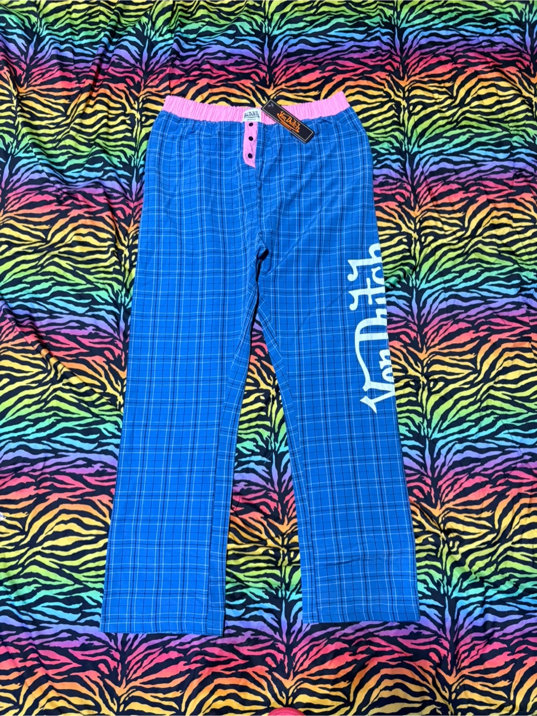 Von Dutch pajama pants in blue plaid with a pink elastic waistband. They're size medium. Made of 60% cotton and 40% polyester. These pants have the Von Dutch logo printed down the side.