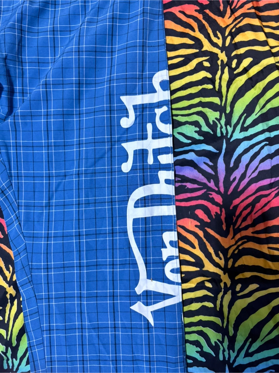 Von Dutch pajama pants in blue plaid with a pink elastic waistband. They're size medium. Made of 60% cotton and 40% polyester. These pants have the Von Dutch logo printed down the side.