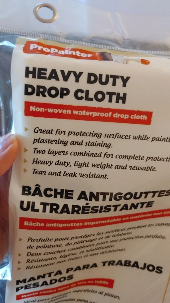 This is a ProPainter heavy duty drop cloth. It's non-woven and waterproof. It's 5 by 10 feet in size. It's tear and leak resistant!