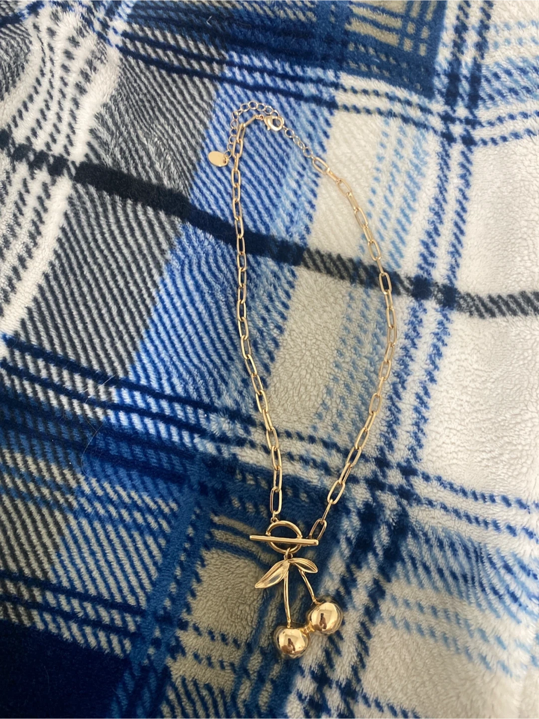 Gold tone necklace featuring a toggle clasp and a charming cherry charm with leaves. It's approximately 18 inches long with an extender. This necklace adds a fun pop of colour! Pick up cash only