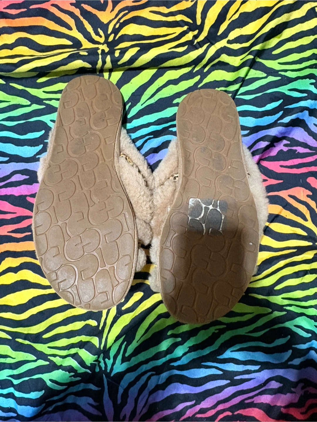 UGG Fluff Yeah slides in a tan colour. They feature a fuzzy exterior with leopard print strap accents. Super cozy for around the house! size 7