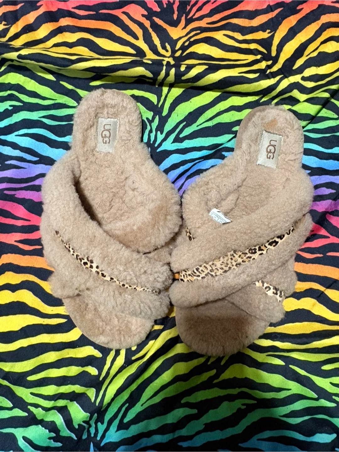 UGG Fluff Yeah slides in a tan colour. They feature a fuzzy exterior with leopard print strap accents. Super cozy for around the house! size 7