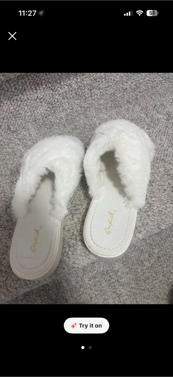 Cozy white fuzzy slippers with a soft faux fur lining. Features a comfortable contoured footbed and a durable sole. Size 8 pick up cash only
