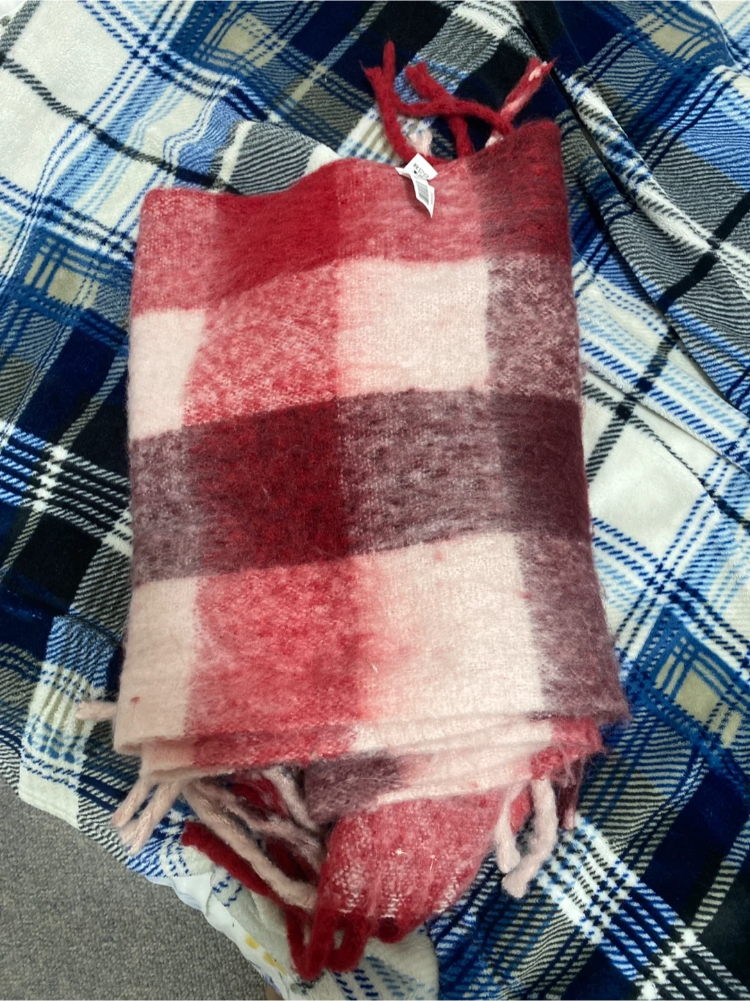 Cozy blanket scarf in a red, pink, and white plaid pattern. It's soft and has fringed edges. Perfect for adding warmth and style to your outfit on cooler days!