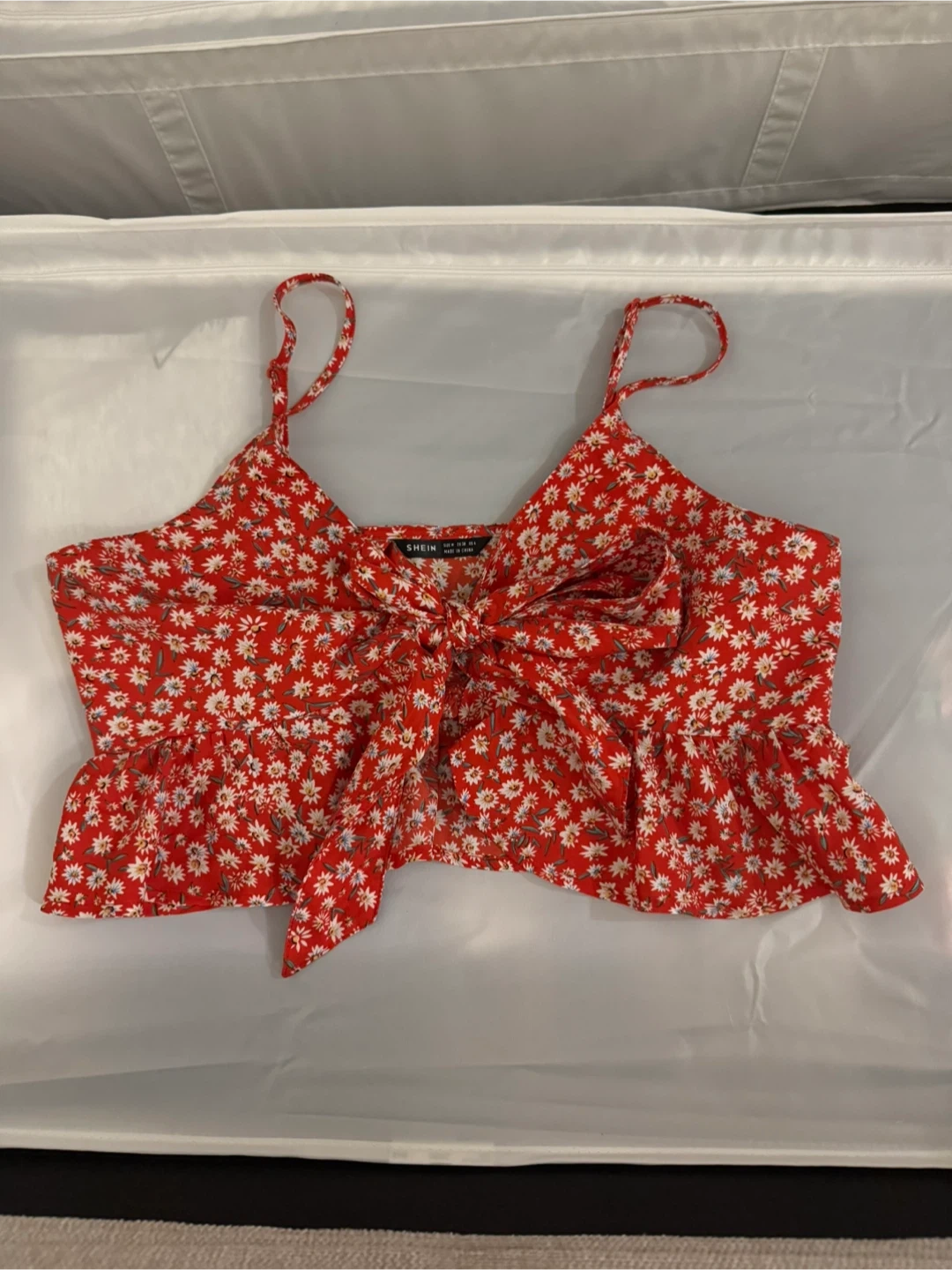 This SHEIN camisole top has a vibrant red floral print. It features adjustable spaghetti straps and a tie front bow. The hem has a ruffled design, giving it a playful look. The material is lightweight and perfect for warmer weather!