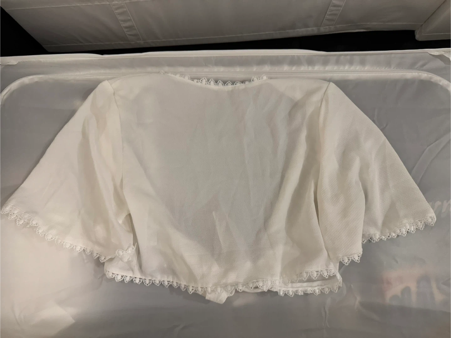 A lovely white tie front top with delicate lace trim. It features wide, fluttery sleeves and a tie front closure. Perfect for layering over dresses or tops! Never worn