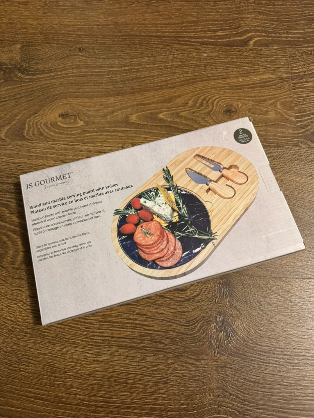 This wood and marble serving board comes with two cheese knives. It's perfect for serving cheese, crackers, meats, and fruits. The set includes a bamboo board with a marble inlay and stainless steel cheese knives. Brand new!