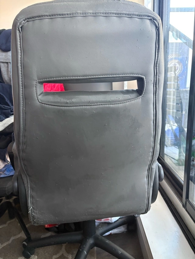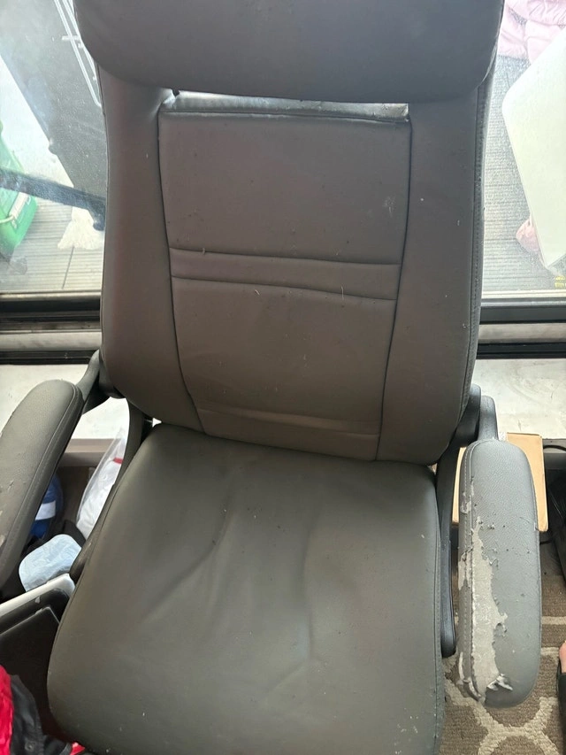 Selling a used office chair that's still functional and comfortable but showing its age. As you can see from the photos, the material is peeling and worn. It's still a comfortable chair for everyday use. Cash accepted. If the ad is up, the chair is available. It's just waiting for a new home (or office!).