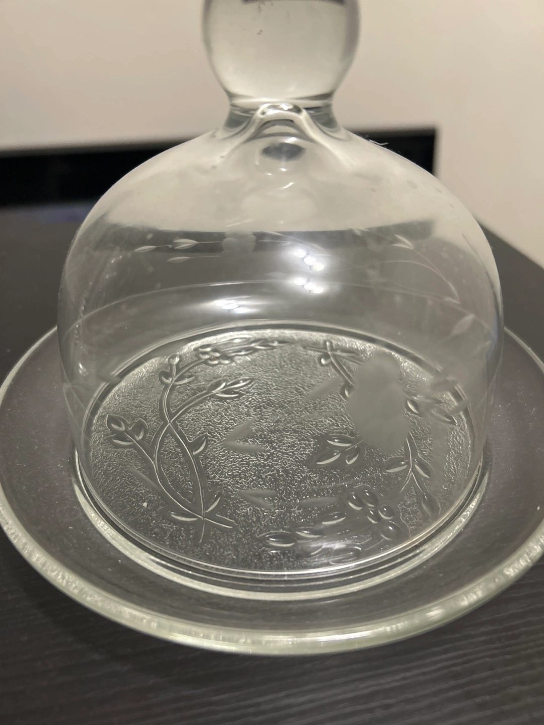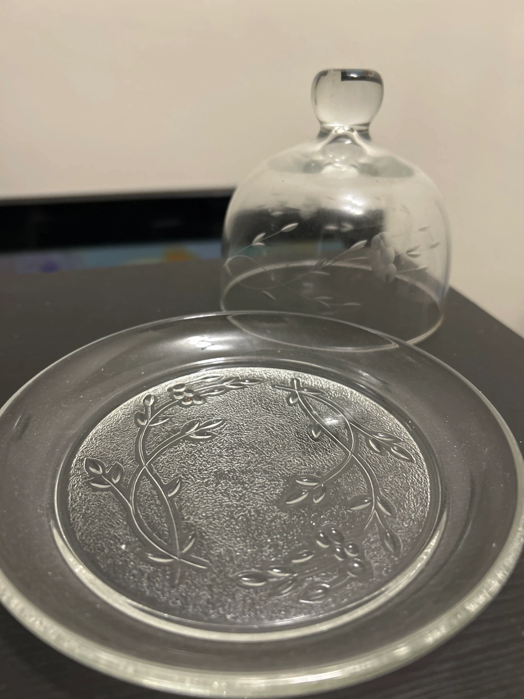 This elegant glass tea set includes a teapot (10$) with a warming stand(5$) ,a serving dish with a cover,((10$) and a handled cup.(4x 3$) It's crafted with delicate etched floral patterns. Perfect for serving warm beverages or small treats.