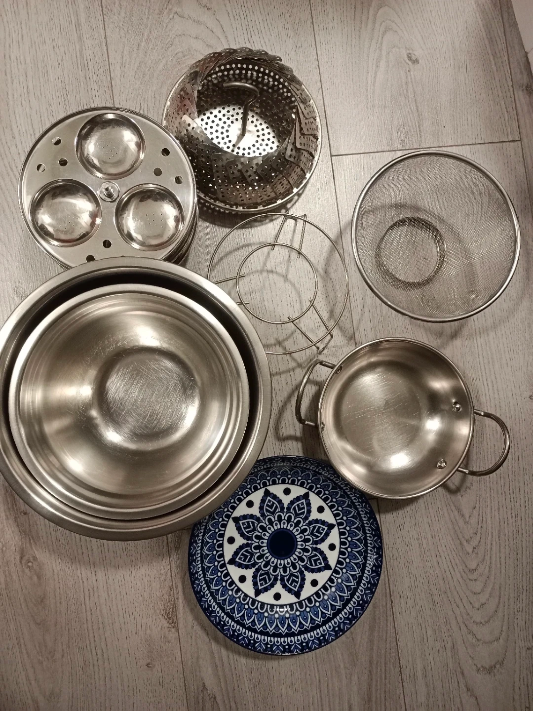 This stainless steel idli maker set includes a steamer basket and multiple idli plates. Striner and mixing bowls... All are used few times