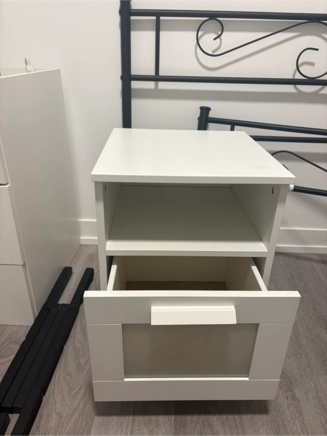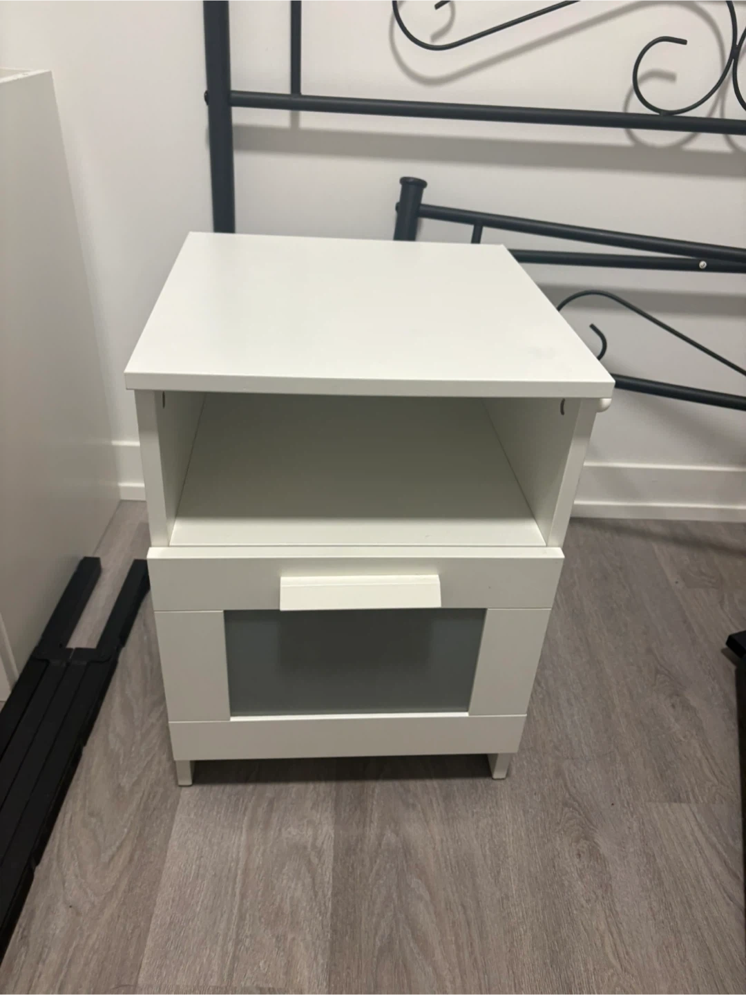 Ikea brimnes night stand. White nightstand with one drawer and an open shelf. The drawer front has a frosted glass panel. It's a practical bedside table.