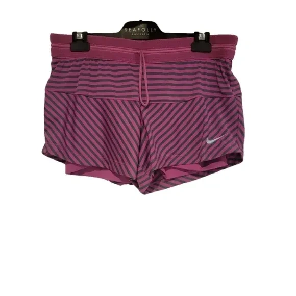 These Nike Dri-FIT running shorts are perfect for your workouts! They're a size medium and feature a stylish striped pattern in shades of pink and grey. Made with 100% polyester for the body and a blend of polyester and spandex for the brief, they're designed to keep you comfortable and dry while you exercise