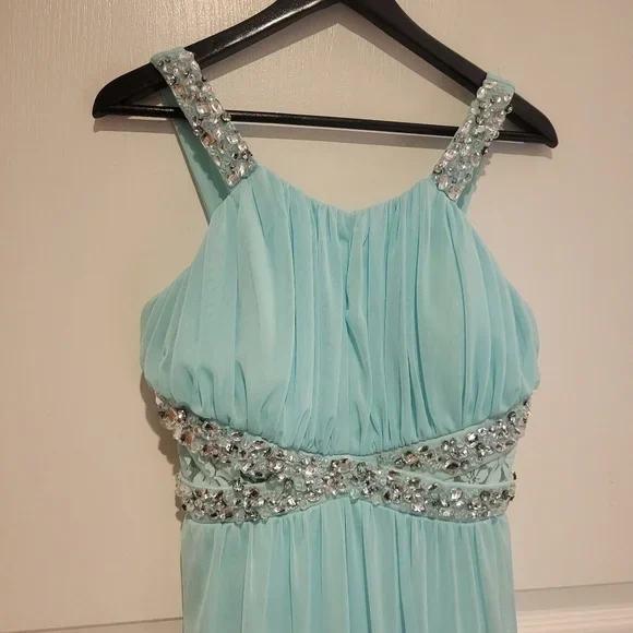 Selling a beautiful Jolie formal dress in a light blue colour. The dress is a size 8 and features lovely detailing with decorative stones. It's in great condition and perfect for a prom, wedding, or any special occasion!