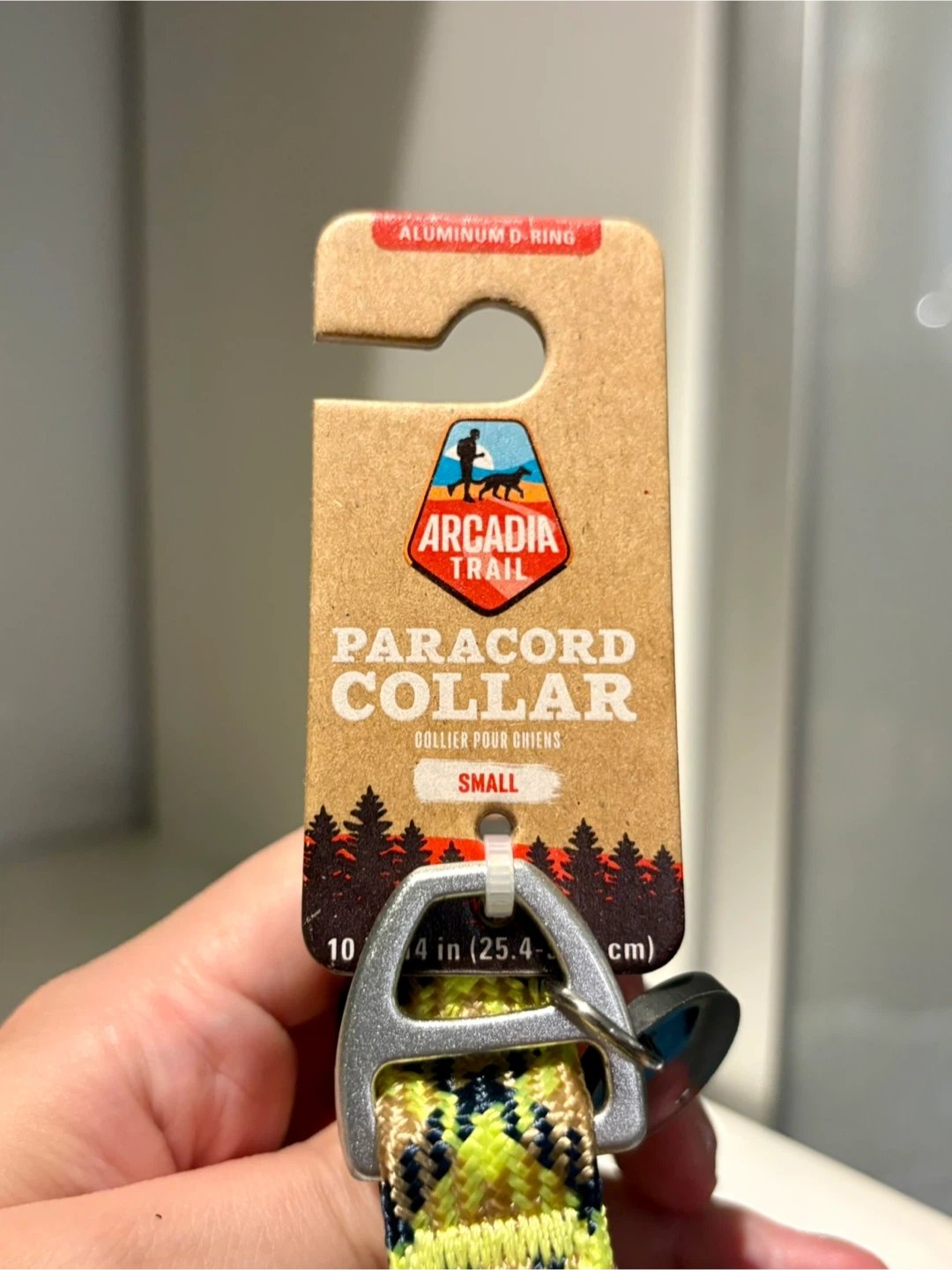 This is an Arcadia Trail paracord collar for dogs. It's a small size, measuring 10-14 inches (25.4-35.6 cm). It features an aluminum D-ring for leash attachment. Very solid collar.