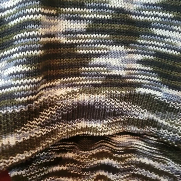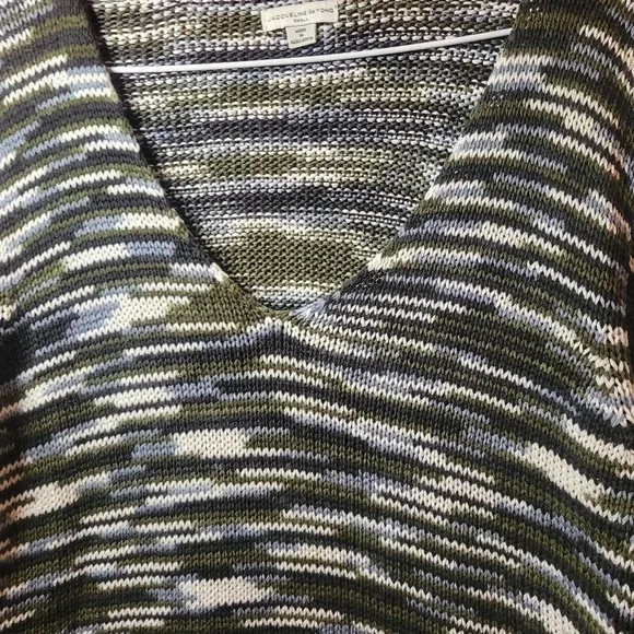 Cozy sweater from Jacqueline de Yong in size small. It features a V-neck and a cool patterned design with shades of green, white, and grey. The Talula Babaton tag shows the exterior is made of 70% virgin wool, 20% polyamide, and 10% cashmere, with a 100% polyester lining