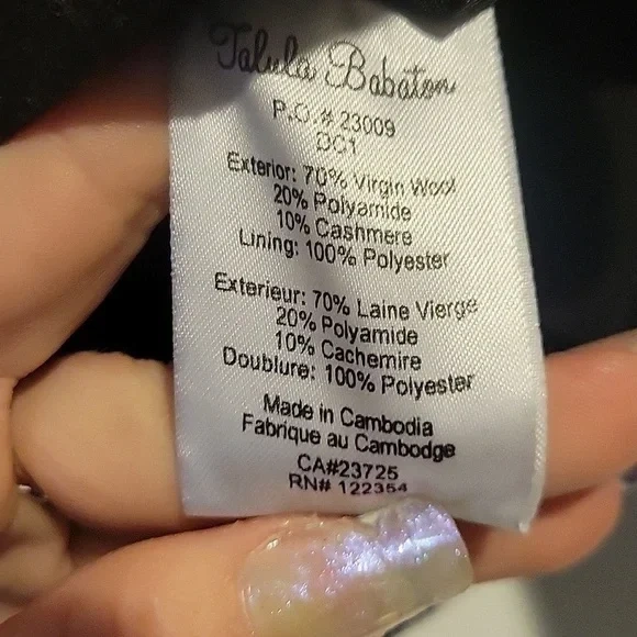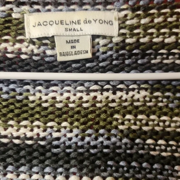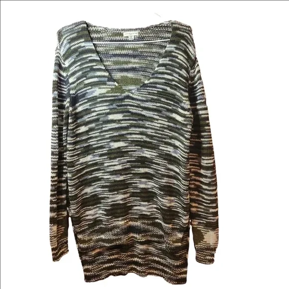 Cozy sweater from Jacqueline de Yong in size small. It features a V-neck and a cool patterned design with shades of green, white, and grey. The Talula Babaton tag shows the exterior is made of 70% virgin wool, 20% polyamide, and 10% cashmere, with a 100% polyester lining