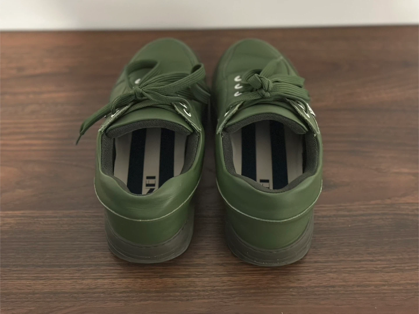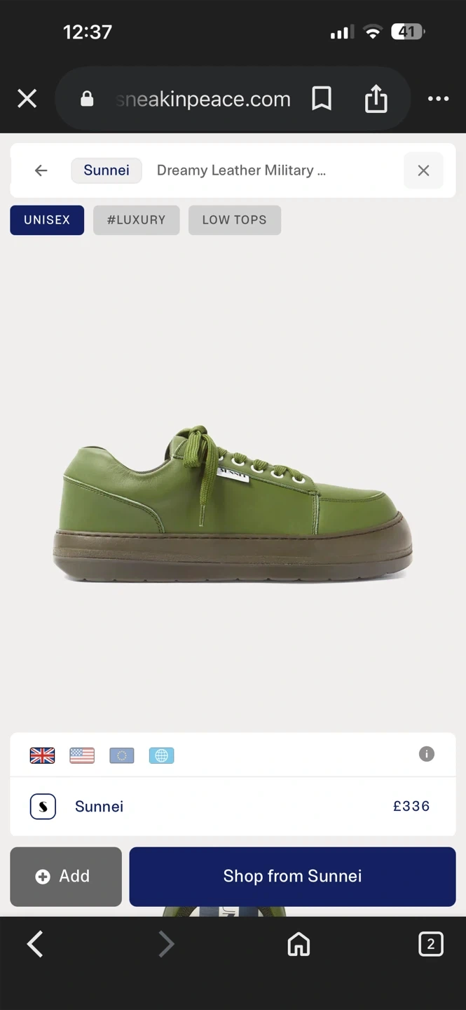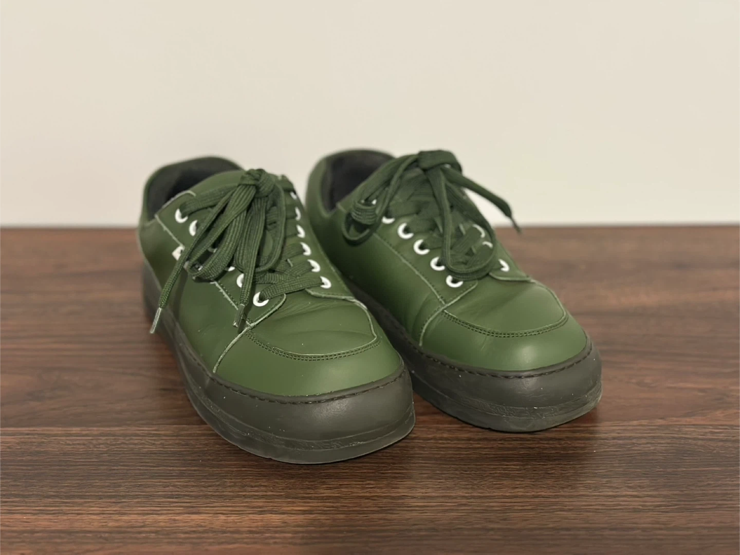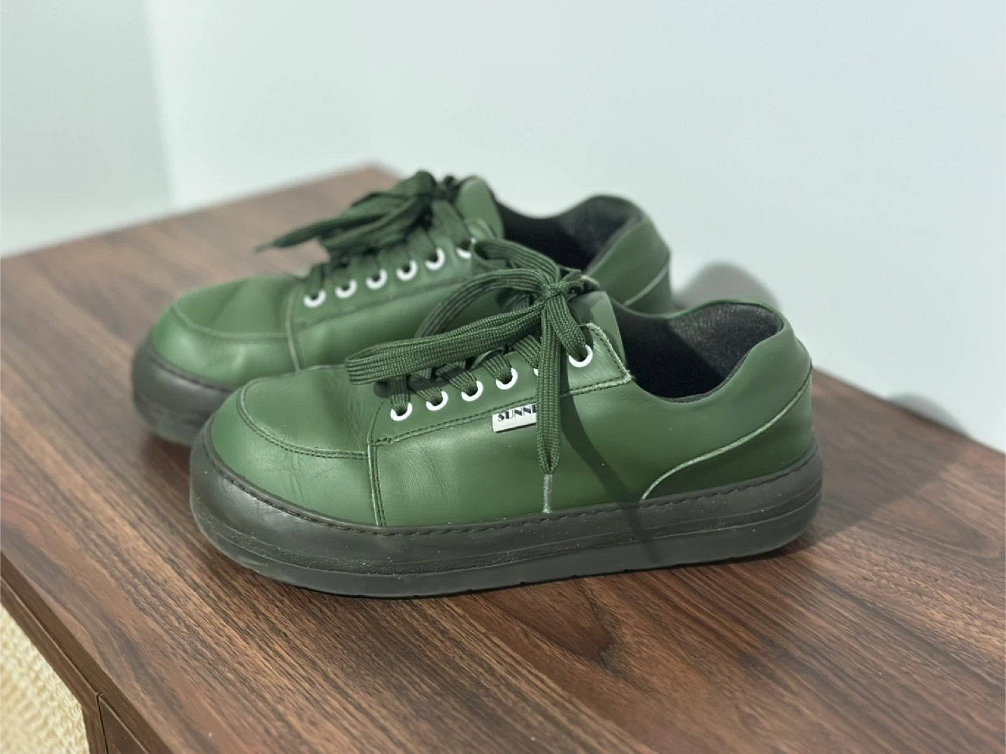 A pair of Sunnei sneakers in a deep green colour. They're made from leather with a thick rubber sole. These low-top sneakers are comfy and barely used.