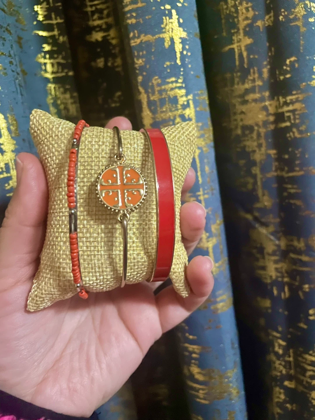 This set includes three bracelets. One is a thin red bangle, another is a gold-tone bangle with an orange circular charm featuring a cross-like design, and the third is a beaded bracelet with red beads and silver-toned accents. It's a fun mix of colors and styles!